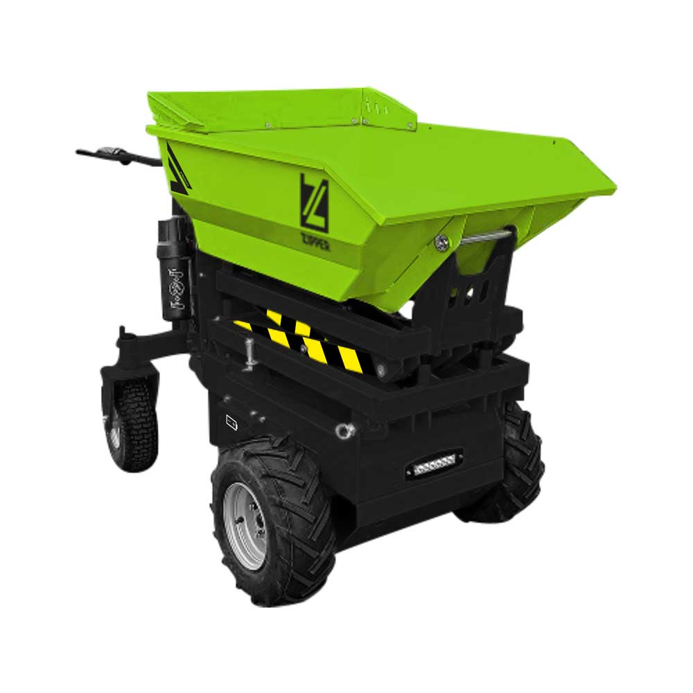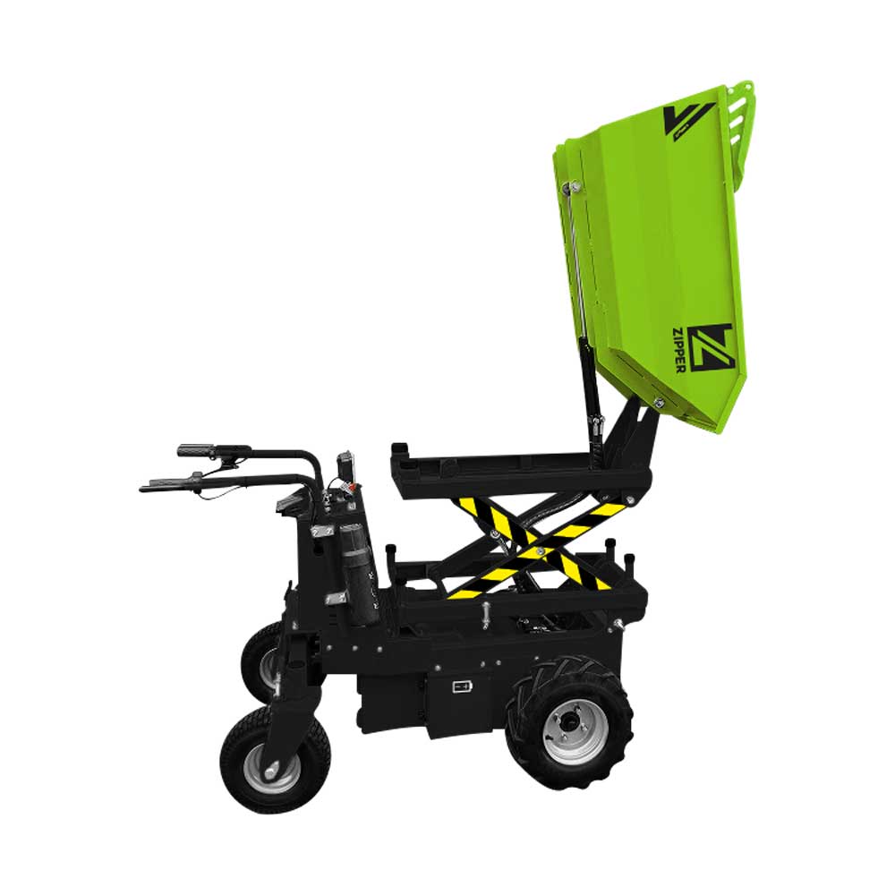 Elektryczna wozidło ZIPPER ZI-ED600HKS z hydraulicznym wywrotem i funkcją podnoszenia (nożyce) - pomocnik do transportu materiałów sypkich. Cicha, bez spalin, idealna również do użytku w pomieszczeniach.