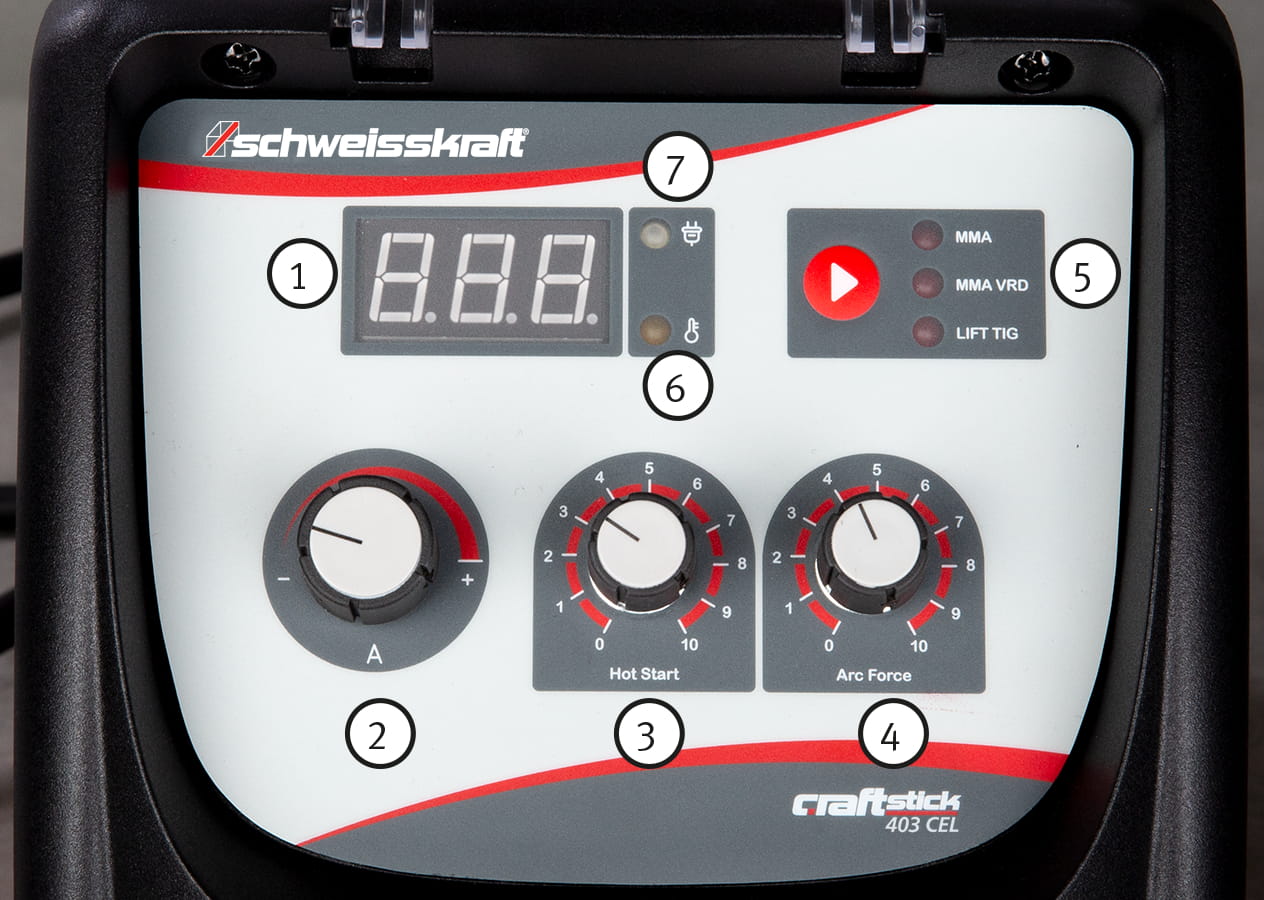 - Start na gorąco: Poprzez chwilowe zwiększenie prądu spawania łuk zapala się bezpiecznie i jest natychmiast stabilny