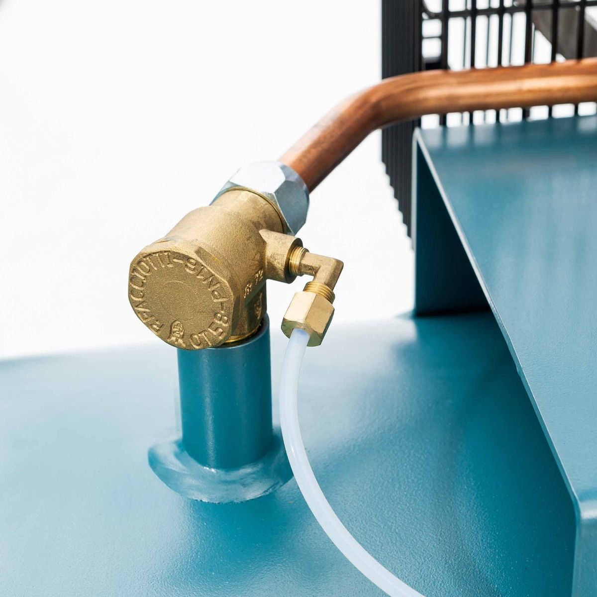 - System odprowadzania kondensatu: Specjalny zawór kondensacyjny umieszczony w zbiorniku pozwala na szybkie i efektywne usuwanie nadmiaru wilgoci, co zapobiega korozji i wpływa na dłuższą żywotność urządzenia.