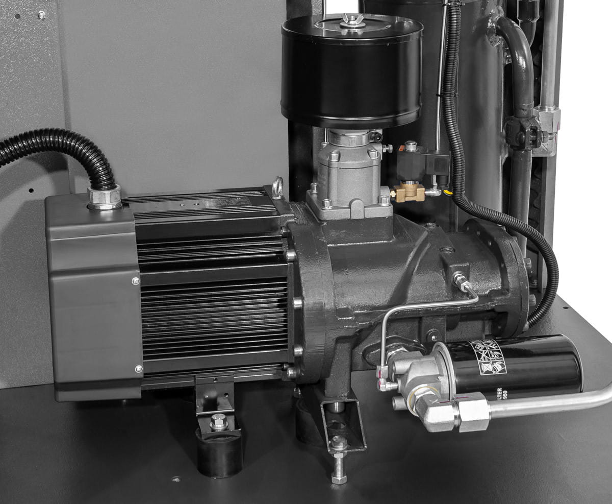 Kompresor APS 20 IVR X G2 wyposażony jest w wydajny silnik synchroniczny z inwerterem, który umożliwia dostosowanie prędkości obrotowej do aktualnych potrzeb, optymalizując zużycie energii. Inwerter steruje pracą silnika, co pozwala na oszczędność energii oraz znaczną redukcję kosztów operacyjnych. Silnik klasy energetycznej IE3 oferuje nawet do 8% większą efektywność w porównaniu do standardowych jednostek napędowych. Dodatkowo, dzięki innowacyjnej konstrukcji bez łożysk, koszty konserwacji są minimalne, co przekłada się na długowieczność i niezawodność kompresora.