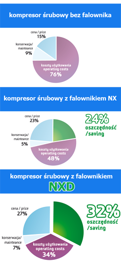 Kompresory śrubowe VDBI ze zintegrowaną przetwornicą częstotliwości NX-D, charakteryzują się szerokim zakresem wydajności. Układ bezstopniowego regulowania obrotami sprężarki to najbardziej ekonomiczny sposób regulacji. Podstawowe zalety to niższe w porównaniu ze sprężarkami sterowanymi tradycyjnie zużycie energii elektrycznej i utrzymywanie stałego zadanego ciśnienia w sieci sprężonego powietrza.