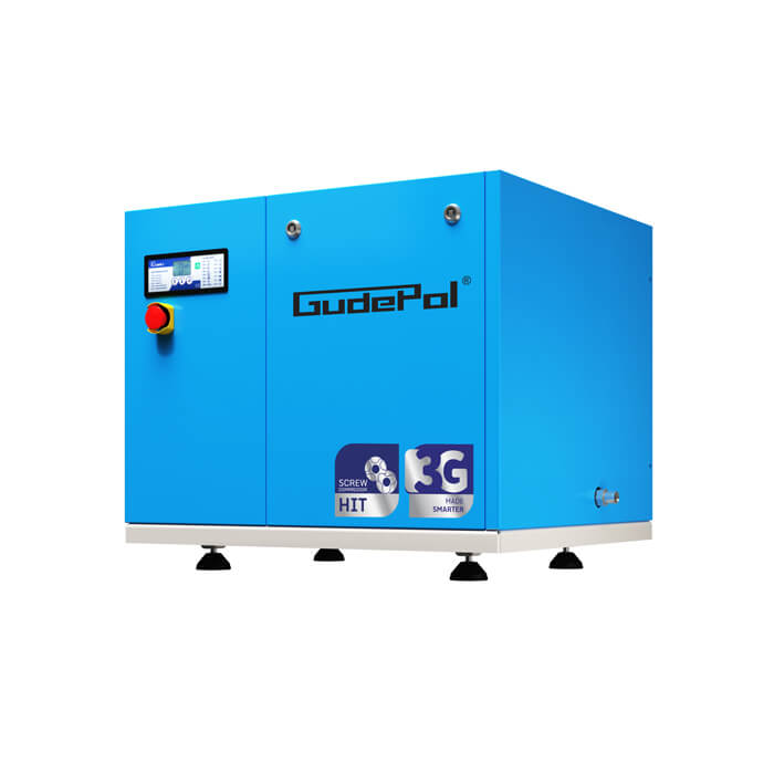 Sprężarka śrubowa GUDEPOL serii HIT-3G to kompleksowe rozwiązanie w postaci źródła sprężonego powietrza w firmie, skonstruowane w oparciu o najnowocześniejsze technologie światowe powiązane z najwyższą jakością materiałów. Kompresor HIT-3G wyposażony jest w panel mikroprocesorowy układu sterowania co jest nowością w kompresorach tej klasy. Rozwiązanie to pozwala na łatwą i czytelną pracę urządzenia. Układ automatycznie wyłapuje nieprawidłowości pracy i informuje, wyświetlając rodzaj usterki, a w przypadku zagrożenia uszkodzenia sprężarki, wyłączy ją.