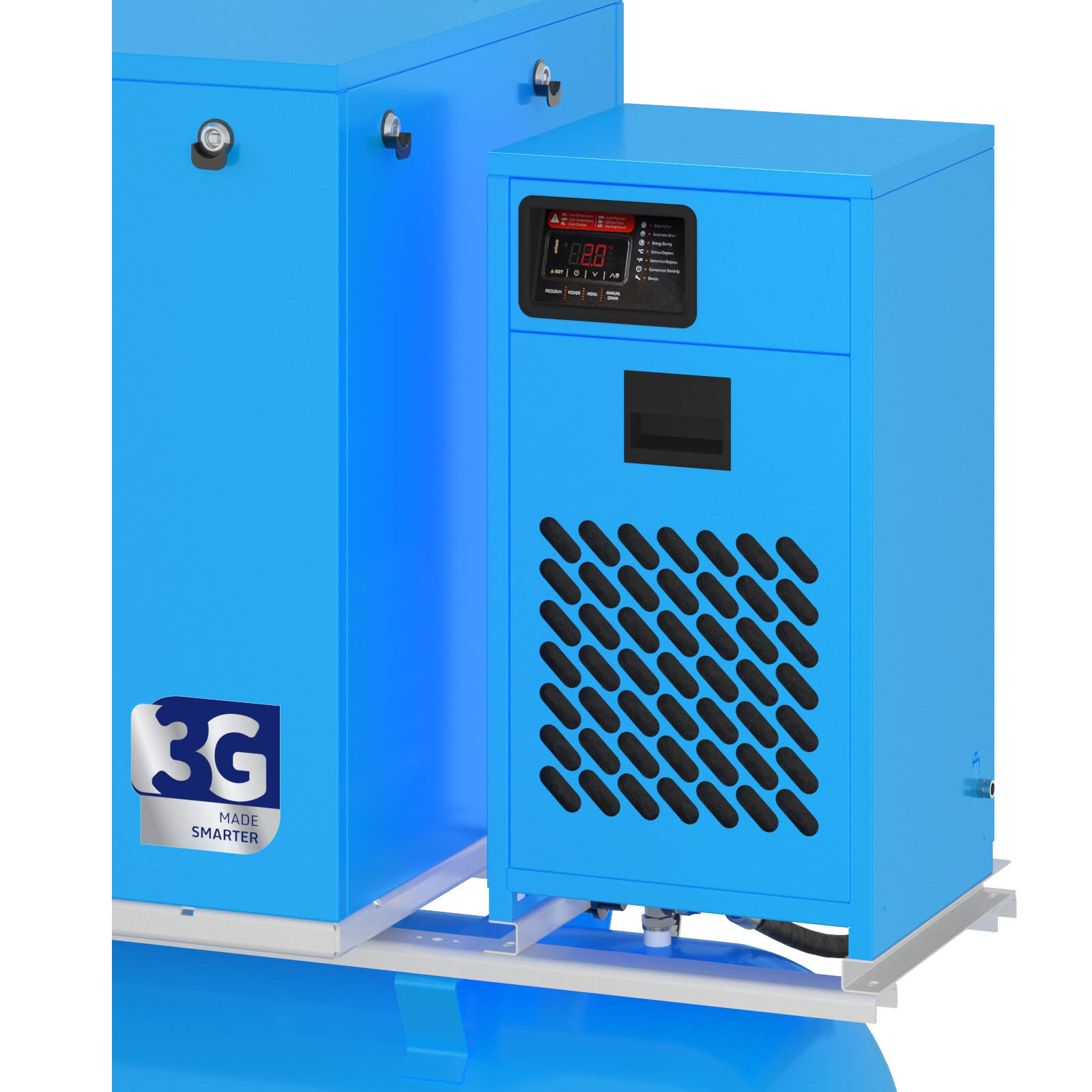 Kompresor SMART-3G wyposażony jest w panel mikroprocesorowy układu sterowania. Informuje użytkownika o trybie pracy kompresora.