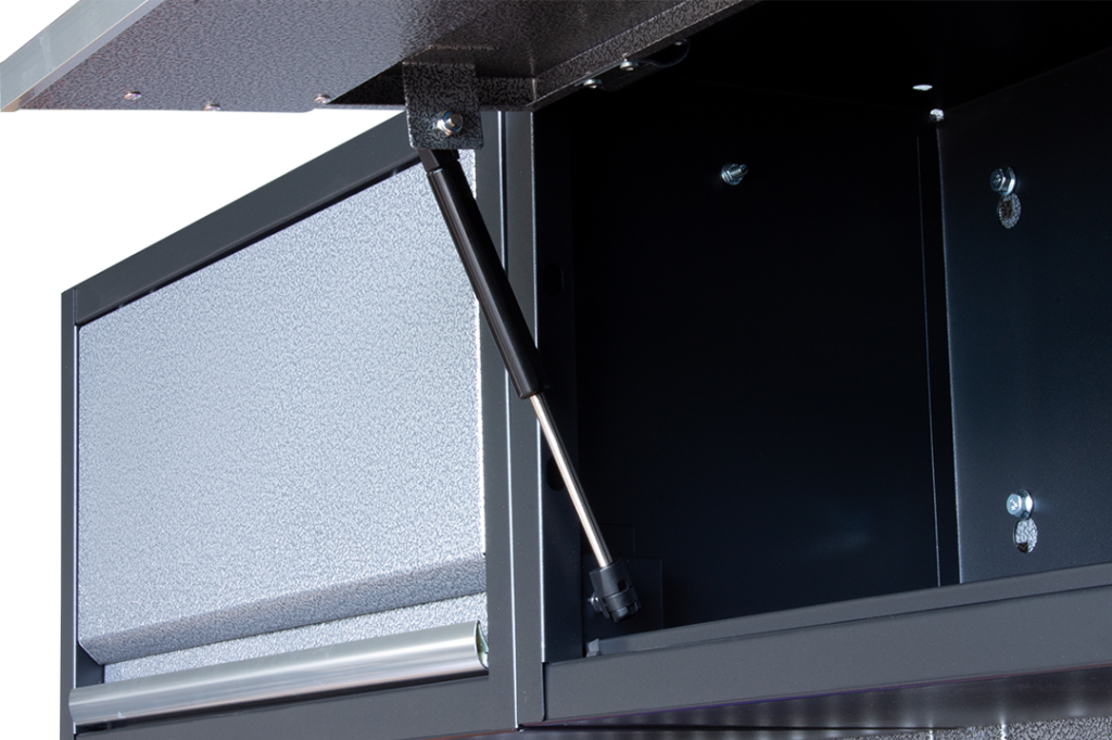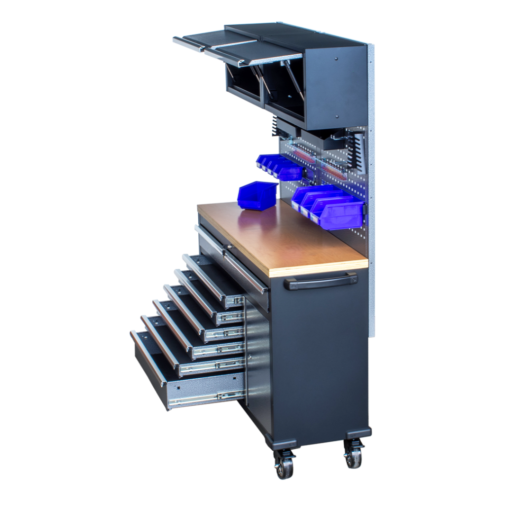 Całość wykonana jest z ocynkowanej stali malowanej proszkowo, co zapewnia wysoką odporność na uszkodzenia mechaniczne oraz korozję. Dzięki solidnym komponentom i przemyślanej konstrukcji, M1360 sprawdzi się zarówno w warsztatach, serwisach technicznych, jak i garażach hobbystycznych.