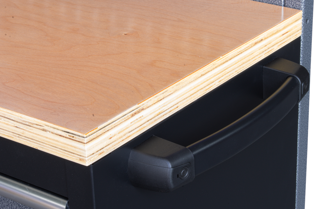 W sercu wózka znajduje się klejony blat z drewna kauczukowego o wymiarach 1360 × 465 × 40 mm. To idealna powierzchnia robocza: