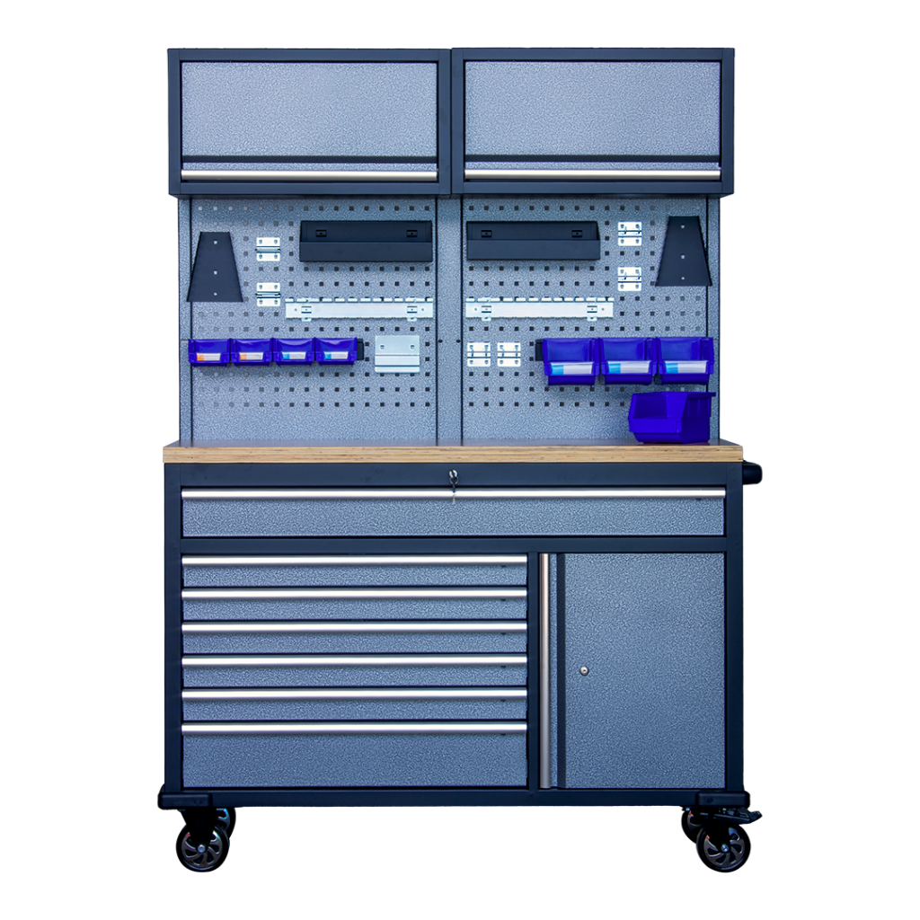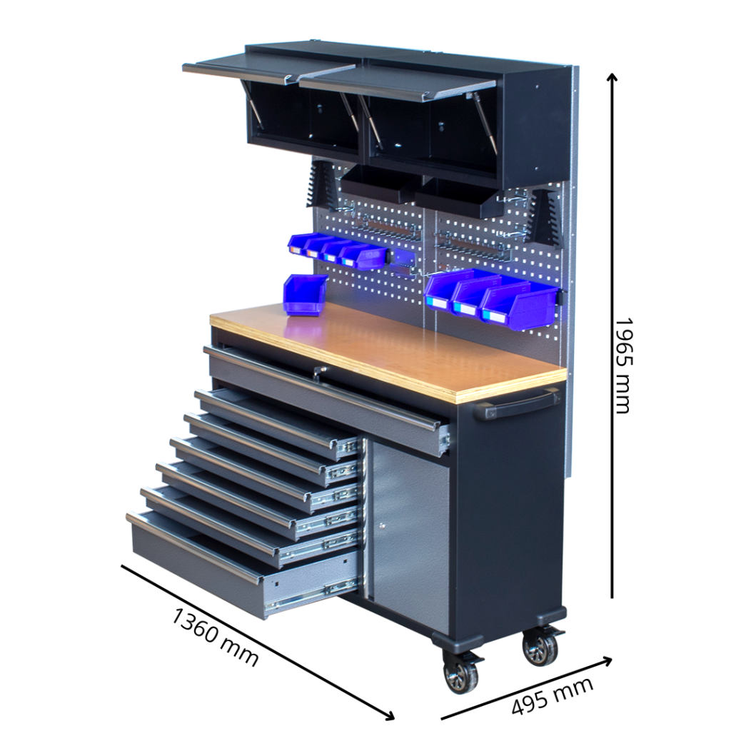 Całość wykonana jest z ocynkowanej stali malowanej proszkowo, co zapewnia wysoką odporność na uszkodzenia mechaniczne oraz korozję. Dzięki solidnym komponentom i przemyślanej konstrukcji, M1360 sprawdzi się zarówno w warsztatach, serwisach technicznych, jak i garażach hobbystycznych.