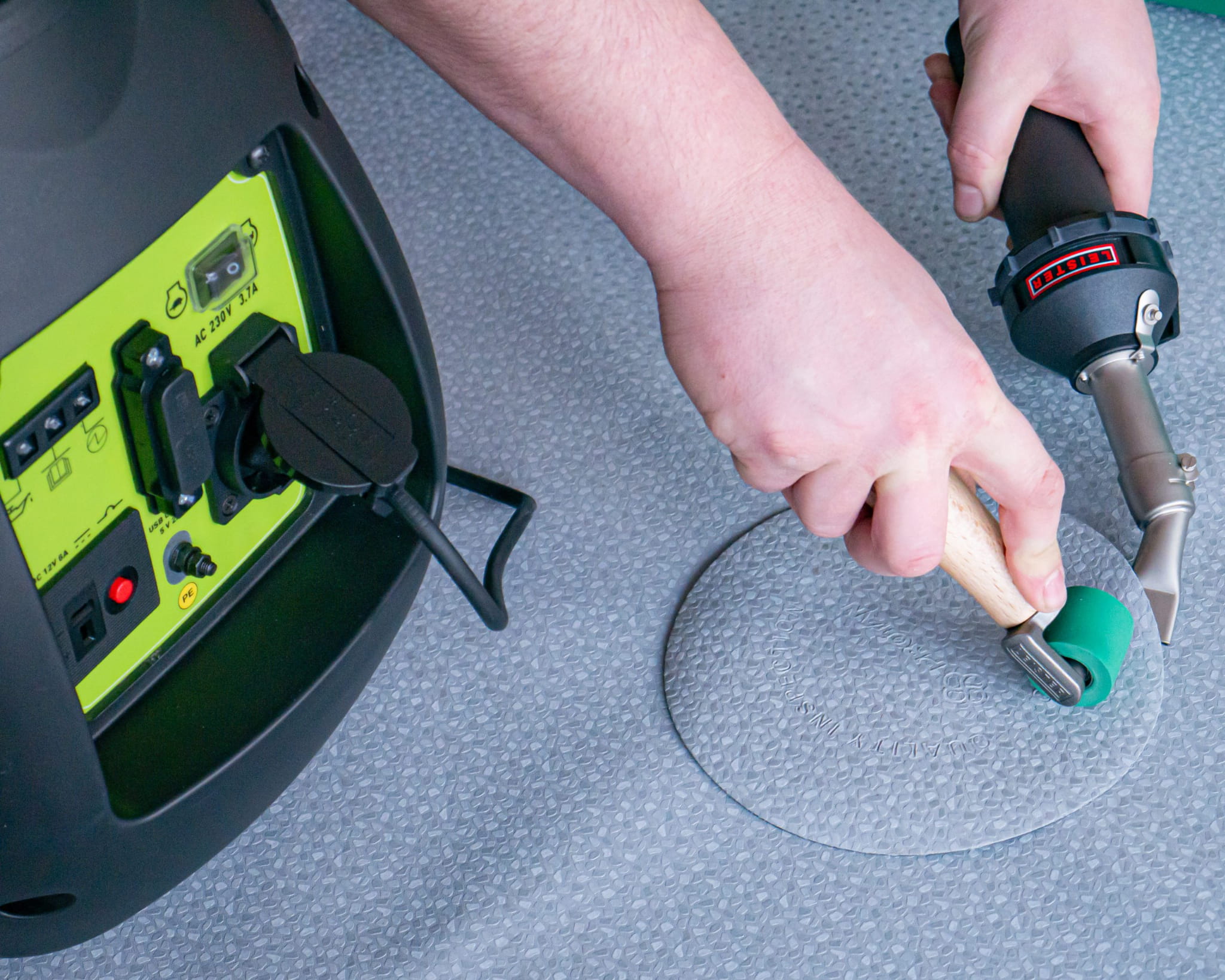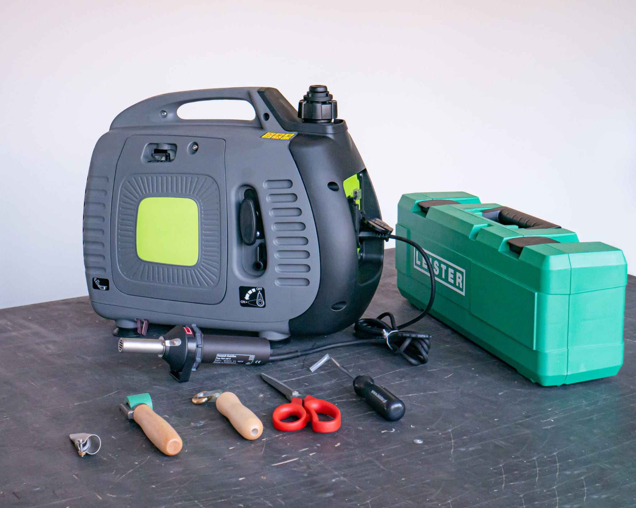 Zestaw składka się z: zgrzewarki Leister HOT JET S, inwerterowego agregatu prądotwórczego, dyszy do zgrzewania, 2 wałków dociskowych, próbnika zgrzewów oraz nożyc. Zgrzewarka Leister HOT JET S to najmniejsze i najlżejsza zgrzewarka wyposażona w silnik szczotkowy, płynne sterowanie temperaturą do 620°C oraz przepływem powietrza. Z kolei, agregat prądotwórczy 1000W to najmniejszy i najlżejszy dostępny na rynku spalinowy agregat prądotwórczy, który jest w stanie zasilić zgrzewarkę. Wbudowany tryb EKO agregatu pozwala na oszczędność paliwa (Pb) oraz ogranicza poziom hałasu. jego dodatkowe atuty to: zintegrowane zabezpieczanie w postaci automatycznego wyłączenia przy niskim poziomie oleju oraz dodatkowe gniazdo USB 5V 2A, które przyda się do ładowania telefonu lub zasilania oświetlenia led.