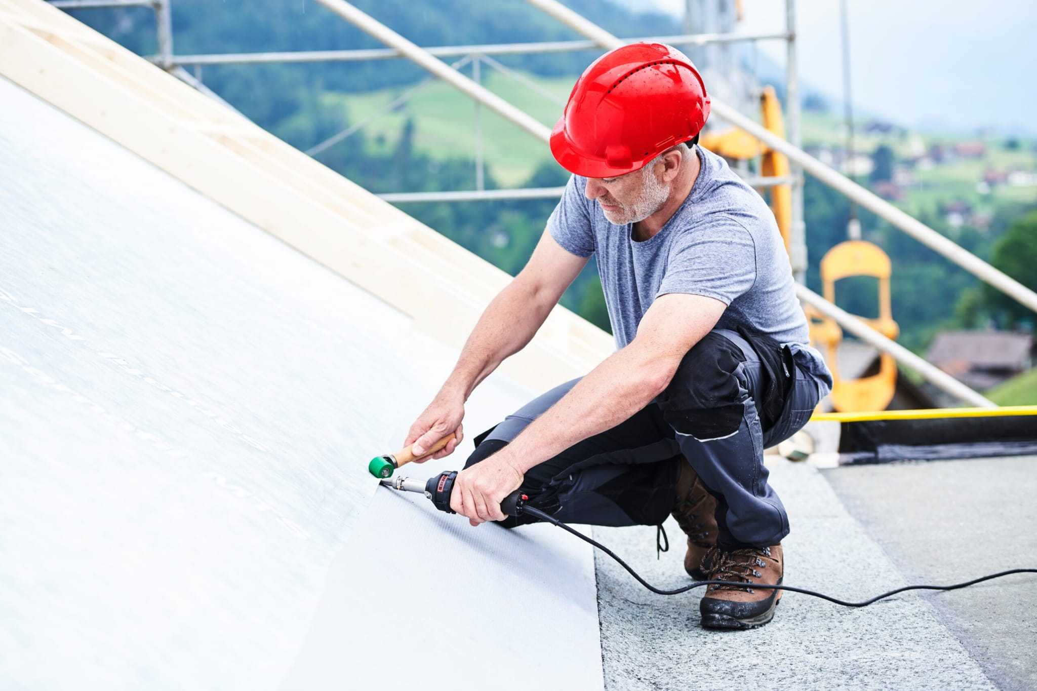 Gotowy, mobilny do zgrzewania folii z tworzyw sztucznych i plandek polecany do zgrzewania folii na dachach wielkopowierzchniowych lub przy doraźnych naprawach hal namiotowych, bez konieczności noszenia i rozwijania przewodów zasilających oraz udostępniania przyłącza elektrycznego. Jego mobilność docenią przede wszystkim brygady montażowe i serwisowe np. podczas montażu konstrukcji pod panele fotowoltaiczne oraz do wykonywania napraw w terenie: dogrzewania łatek, uszczelniania przepustów i narożników itd.