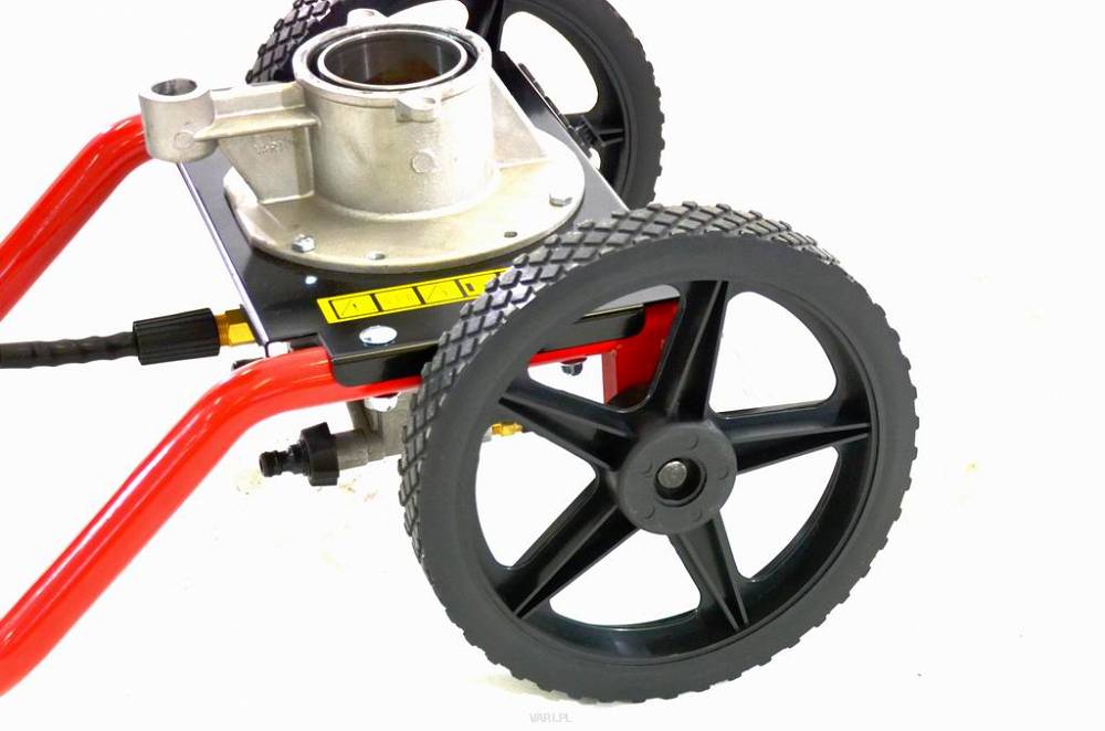 Jest to wysokowydajna myjka ciśnieniowa z wysokiej jakości pompą. Intensywność czyszczenia można kontrolować, wybierając jedną z trzech dysz ze stali nierdzewnej, które są bardzo łatwe do wymiany. Zmywarka jest również wyposażona w duże kółka, które ułatwiają obsługę.