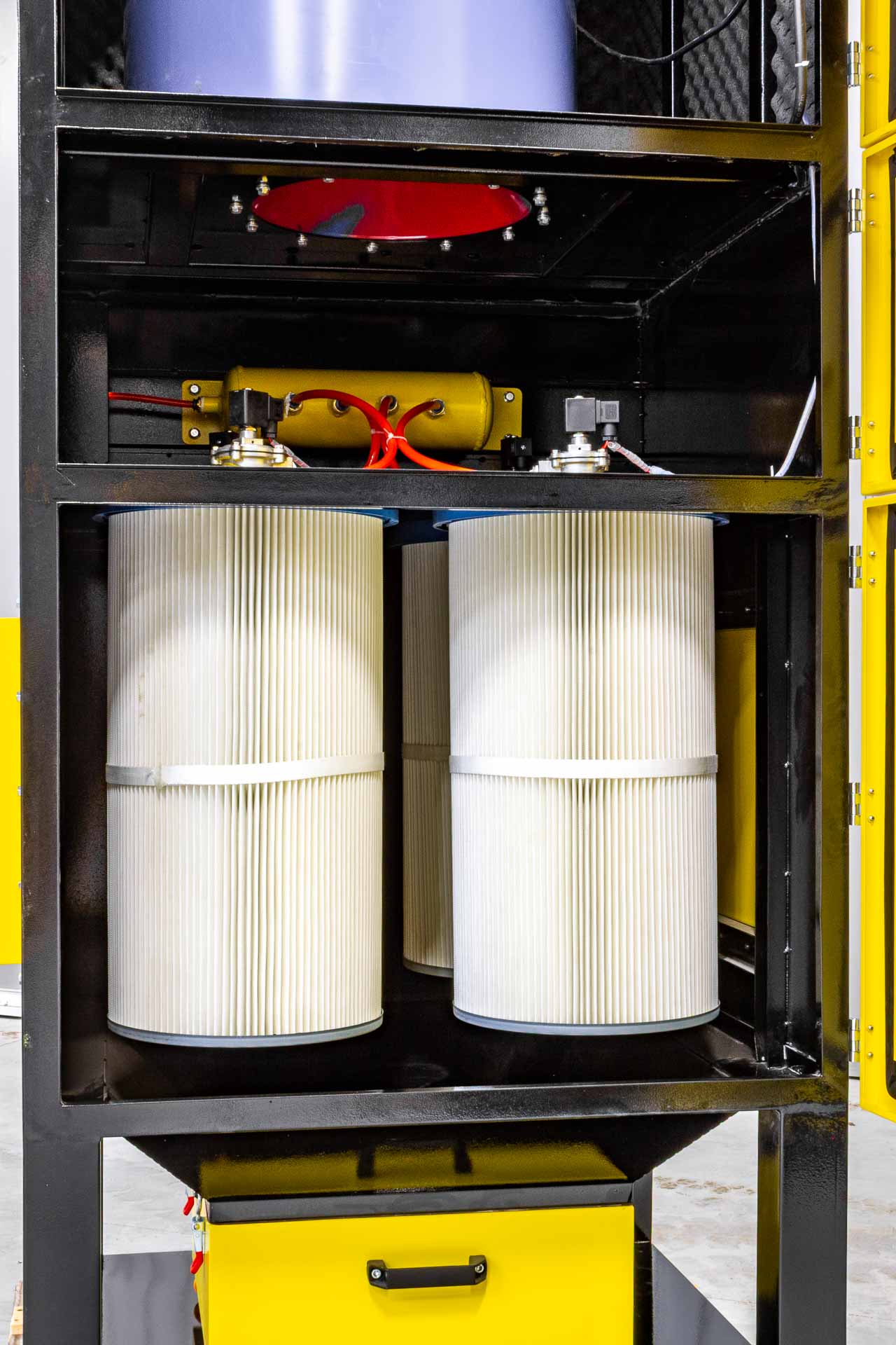 - Pneumatyczne czyszczenie impulsowe (1″ × 4 zawory) – filtry same się oczyszczają podczas pracy.