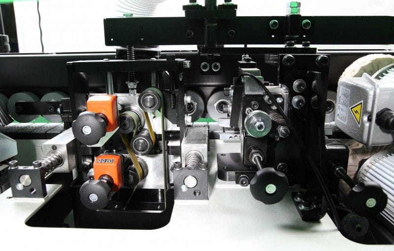 - Rolka dociskowa- jednostka rolki dociskowej poprawia wiązanie pomiędzy krawędzią, a materiałem. Jednostka jest mechanicznie dociskana sprężyną, odpowiednia do systemu konfiguracji oraz można dostosować ją dokładnie do wymaganej grubości krawędzi.