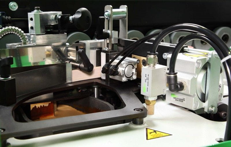 - Jednostka wstępnego frezowania- dwie głowice diamentowe frezujące zapewniają, że krawędź obrabianego przedmiotu jest całkowicie prosta w stosunku do materiału klejonego.
