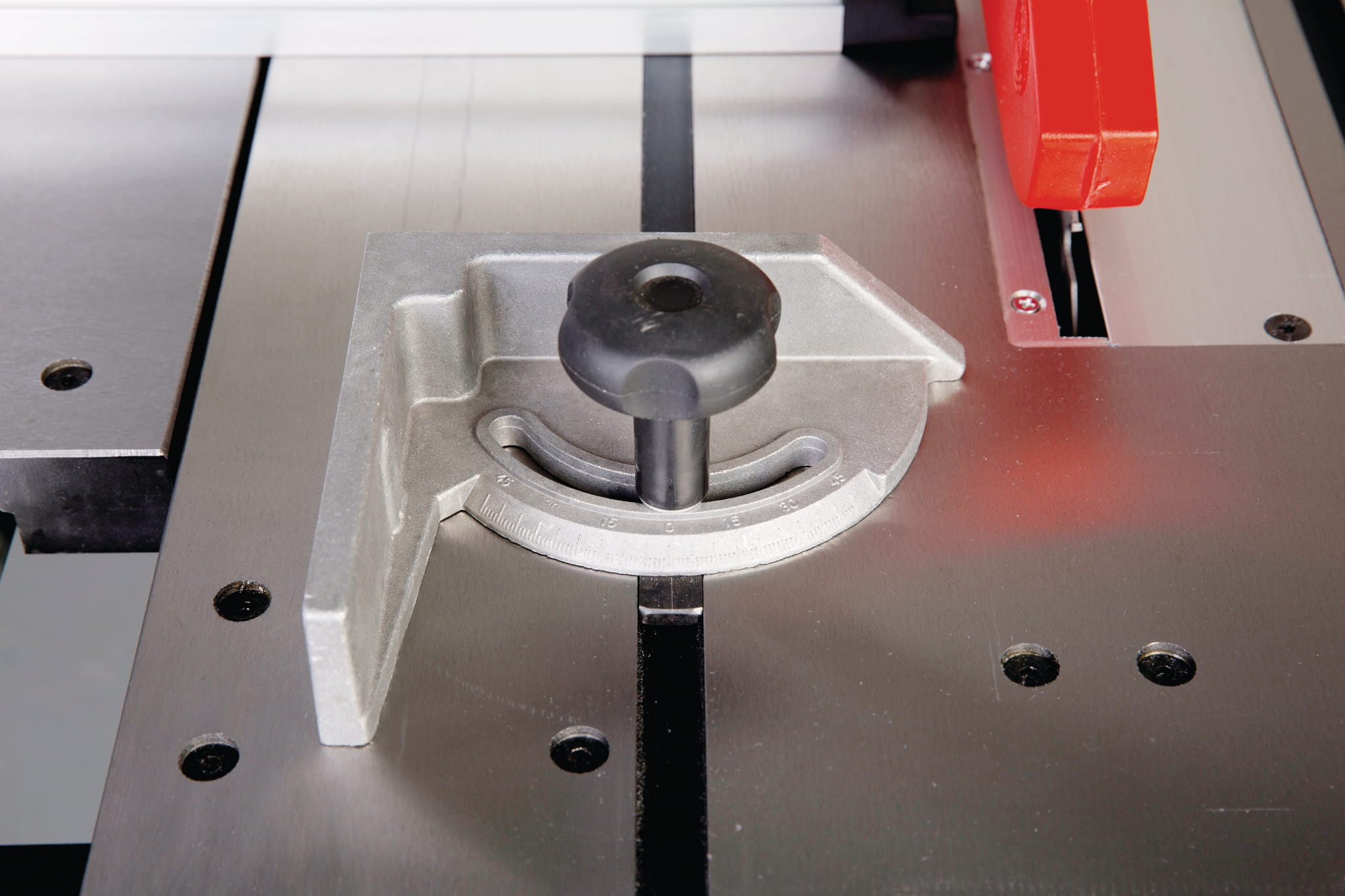 - Przechył tarczy piły w zakresie od 90° do -45° w lewo, precyzyjny, dokładny co do stopnia i wygodnie regulowany za pomocą pokrętła ręcznego i skali