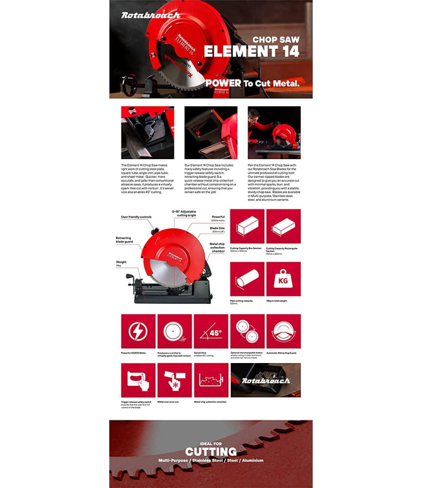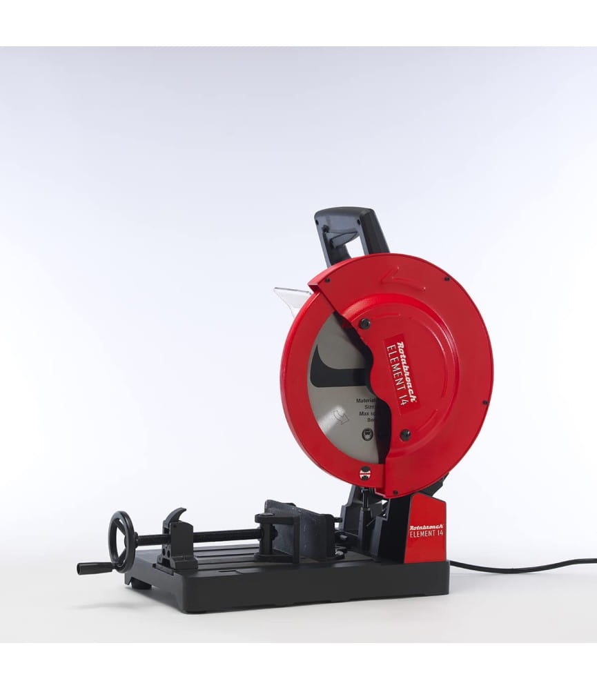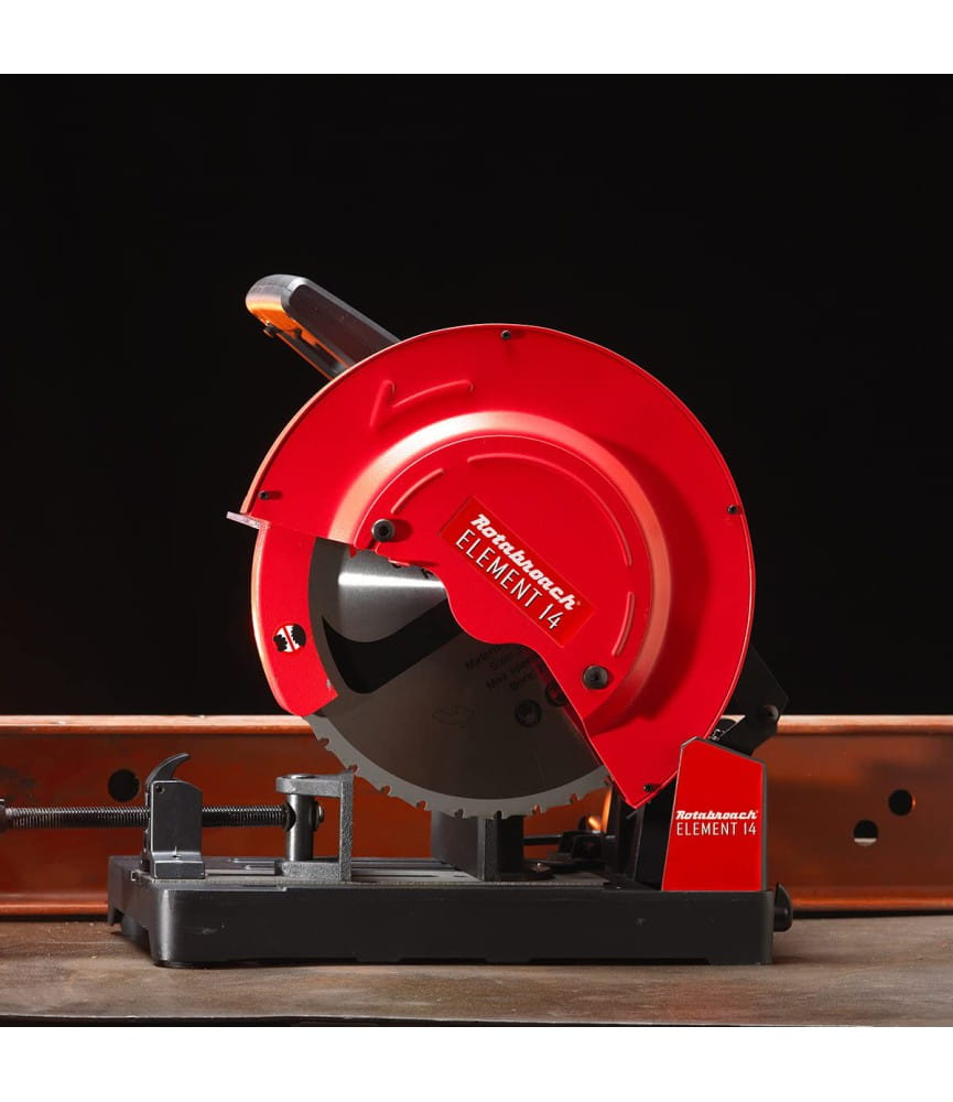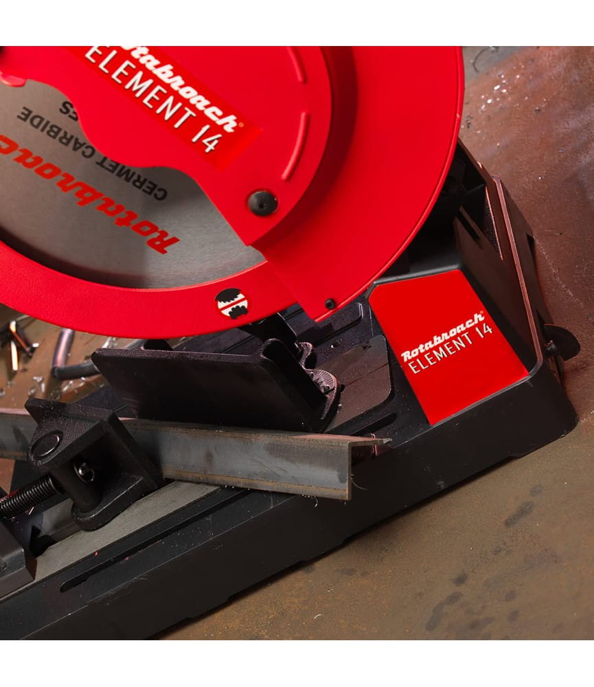 Przecinarka do cięcia stali tarczami z uzębieniem z węglika spiekanego Rotabroach Element 14 umożliwia przecinanie kształtowników stalowych, rur, płaskowników stalowych. Zaletą stosowania przecinarki z tarczami z uzębieniem z węglika spiekanego jest ograniczenie do minimum powstawania iskier podczas cięcia oraz nagrzewania ciętego materiału. Całość ciepła powstającego podczas cięcia odprowadzana jest poprzez wióry oraz przez tarczę tnącą. Właśnie ze względu na odprowadzanie ciepła, w tego typu przecinarkach nie powinien być cięty materiał o pełnym przekroju, a wyłącznie kształtowniki.