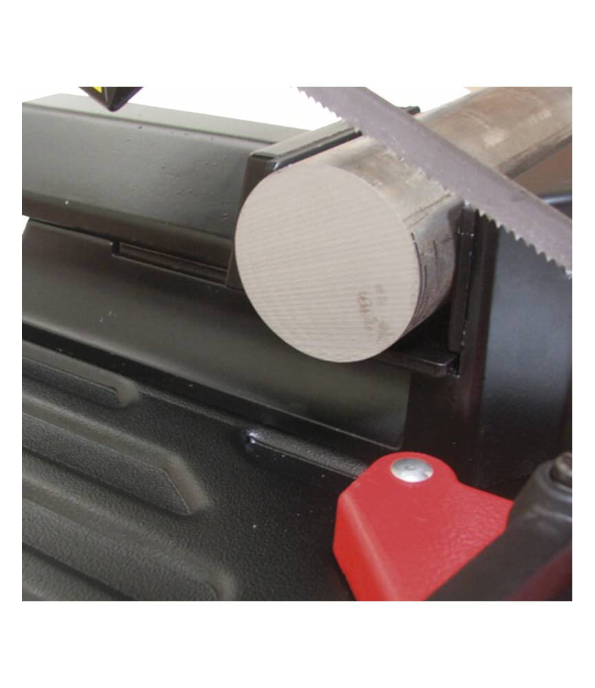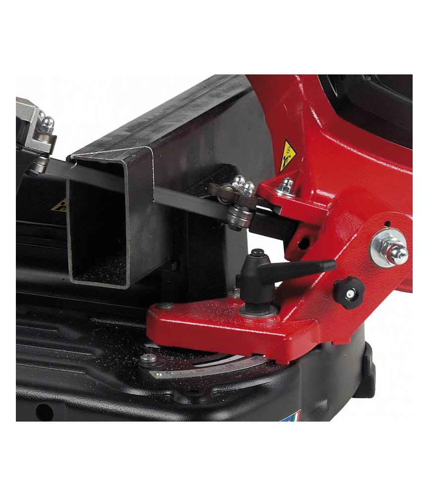 Skrętne ramię przecinarki daje możliwość cięcia materiału pod kątem do 45[stopnie]. Prowadzenie taśmy za pomocą łożysk kulowych co gwarantuje dokładną i cichą pracę bez wibracji oraz wydłuża żywotność taśmy tnącej.