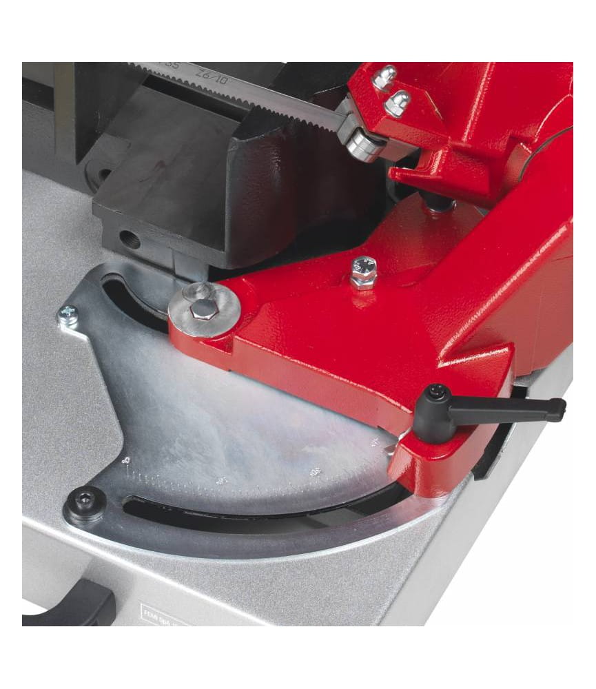 Skrętne ramię przecinarki daje możliwość cięcia materiału pod kątem do 45[stopnie]. Prowadzenie taśmy za pomocą łożysk kulowych co gwarantuje dokładną i cichą pracę bez wibracji oraz wydłuża żywotność taśmy tnącej.