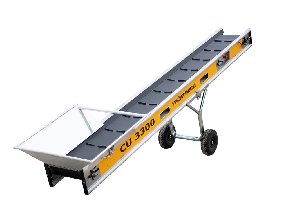 Przenośnik taśmowy BARON CU3300 umożliwia sprawny transport wszelkiego rodzaju materiałów budowlanych (od sypkiego piachu po ciężki gruz budowlany). Zamknięty profil boczny gwarantuje wysokie bezpieczeństwo pracy.