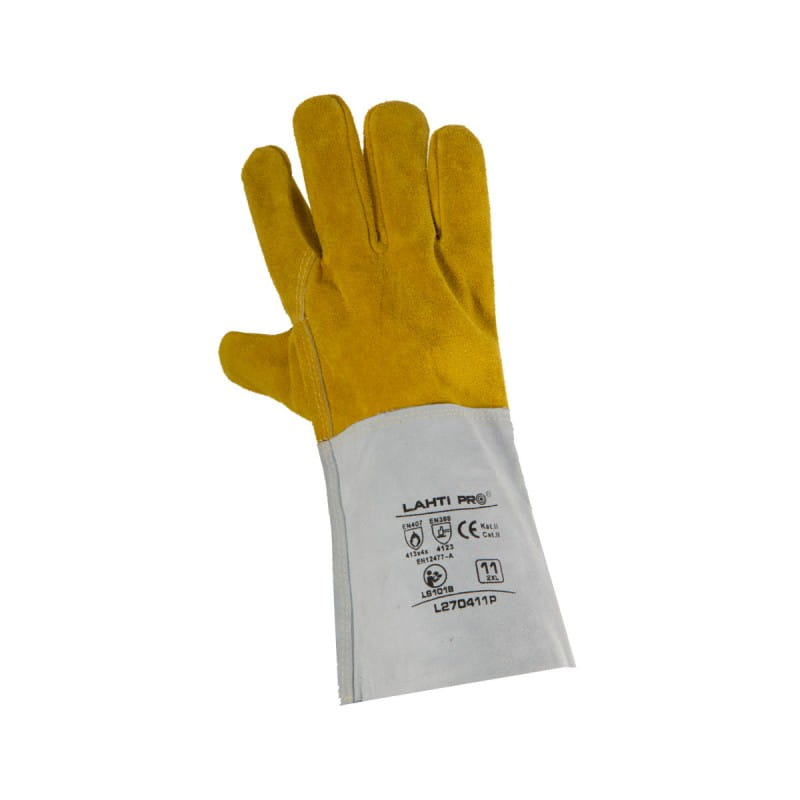 Długość rękawicy 35 cm. Część chwytna rękawicy wykonana z jednego kawałka skóry. Wysoka odporność na możliwość zapalenia oraz drobne rozpryski stopionego metalu (poziom odporności 4).