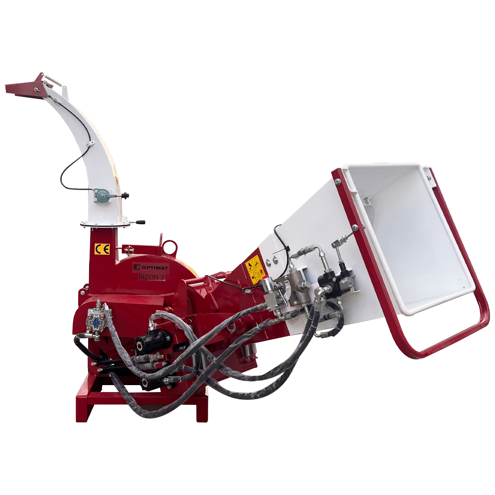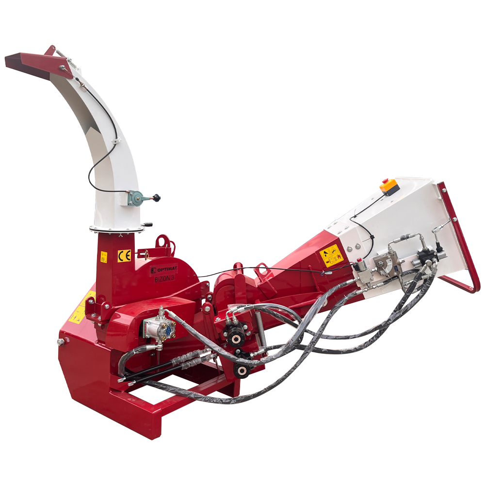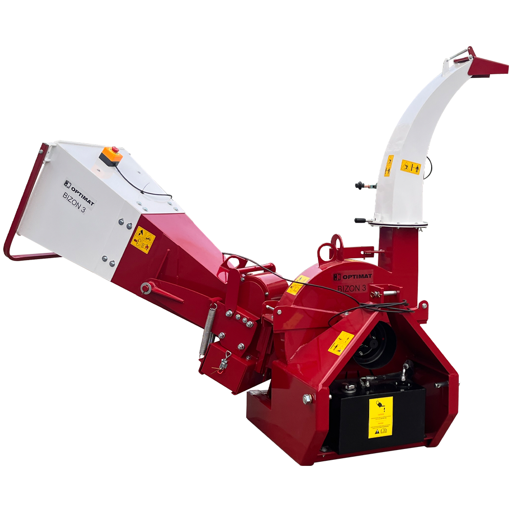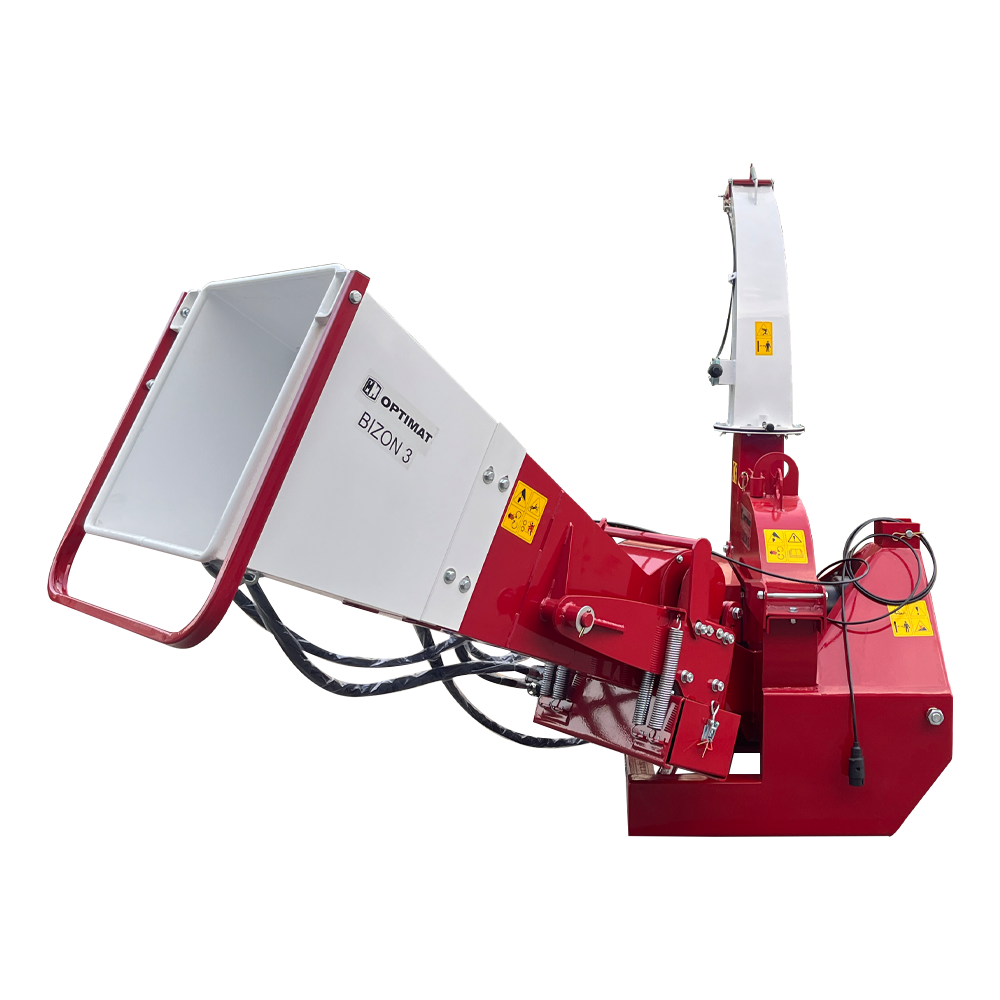 OPTIMAT BIZON 3 to nowoczesny, ciężki rozdrabniacz tarczowy z hydraulicznym podajnikiem, przeznaczony do współpracy z ciągnikami o mocy od 18 KM wzwyż. Maszyna umożliwia rozdrabnianie gałęzi i pni o średnicy do 100 mm, a dzięki dwóm hydraulicznym wałkom podającym zapewnia szybkie, płynne i bezpieczne podawanie materiału.