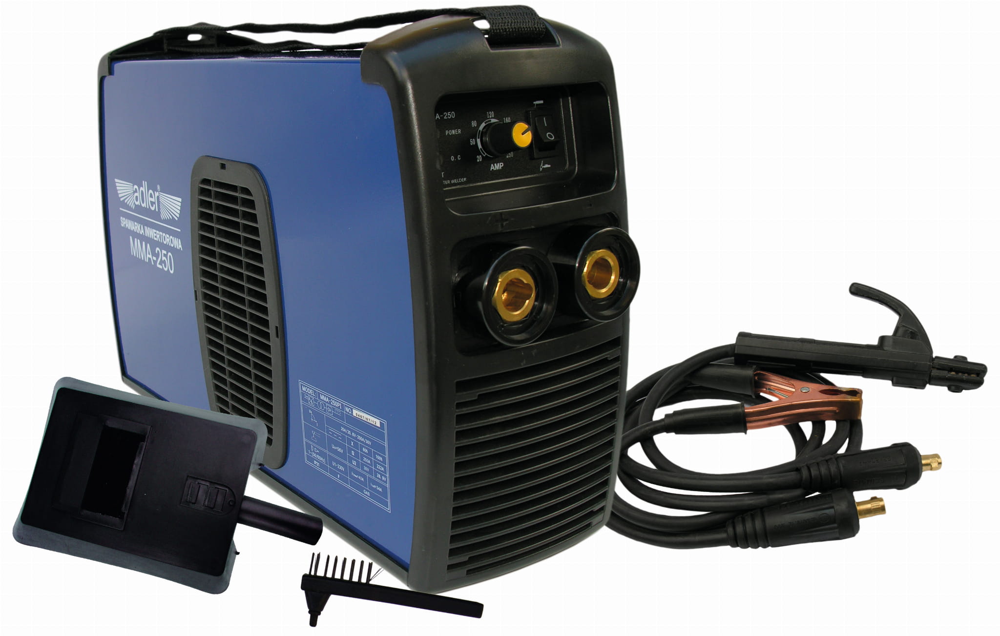 Elektroniczna spawarka Adler MMA-250 zbudowana w oparciu o tranzystory bipolarne IGBT. Urządzenie spawa prądem stałym DC. Posiada płynną, bezstopniową regulację prądu spawania. Spawanie metodą MMA z wykorzystaniem funkcji ARC FORCE, HOT START, ANTI STICK. Długie przewody spawalnicze o przekroju 25mm2, w całości z miedzi. Urządzenie może pracować z szeroką gamą materiałów takich jak: stal, stal nierdzewna, tytan, miedź, nikiel oraz ich stopy. Dwa współpracujące ze sobą wentylatory usprawniają system chłodzenia i tym samym znacząco przedłużają cykl pracy i podnoszą sprawność spawarki. Układ elektroniczny składa się z jednej płytki scalonej co razem z częściowo metalową i plastikową obudową sprawiło, że spawarka Adler MMA-250 to lekkie i przenośne urządzenie.