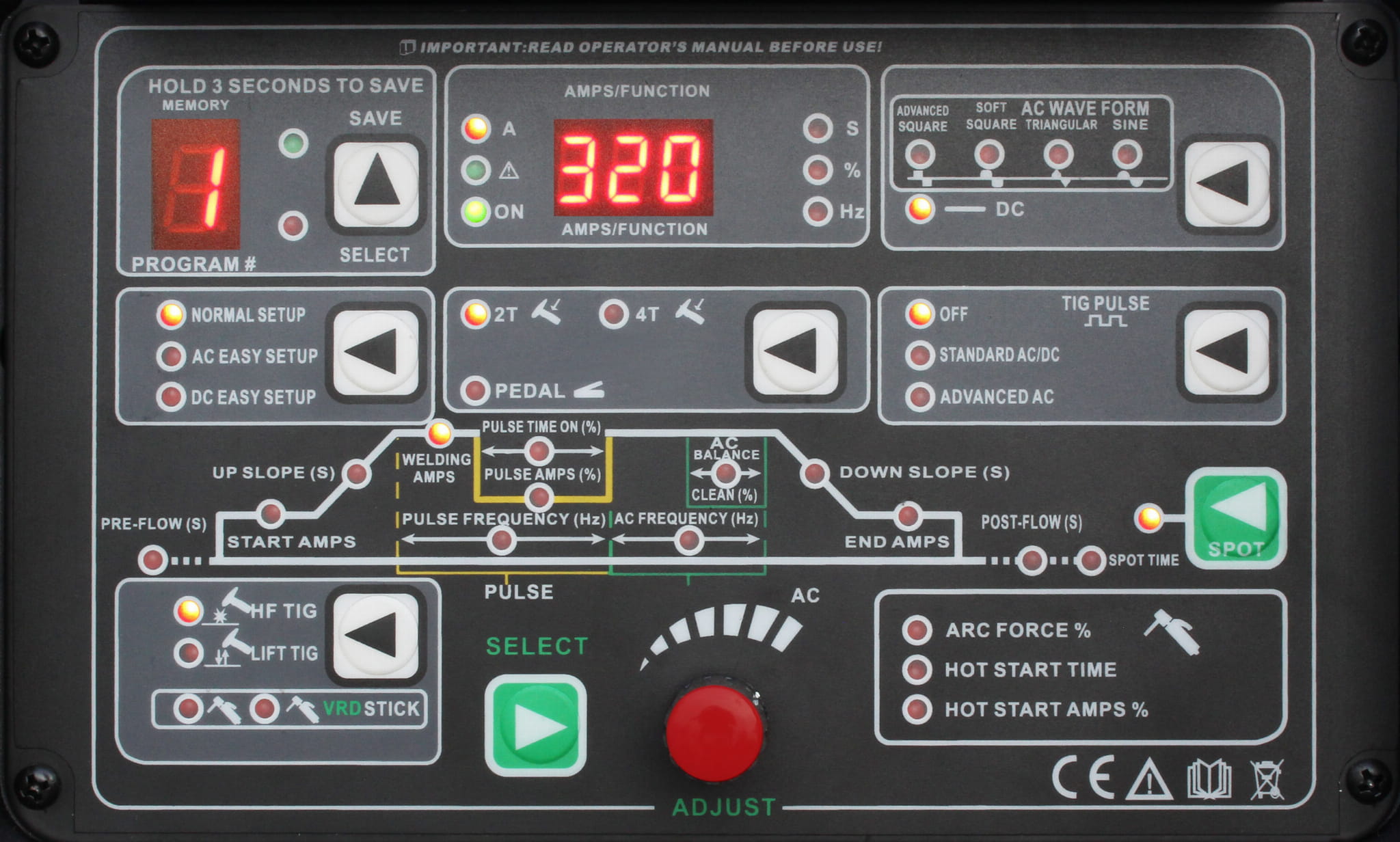 Urządzenie najwyższej klasy wyznacza nowe standardy wśród maszyn spawalniczych AC/DC, a przyjazny panel sterowania zapewnia dobór wszystkich niezbędnych parametrów pracy. W skład standardowego wyposażenia wchodzi chłodzony cieczą uchwyt TIG PARKER SUREGRIP SGT18 4M.