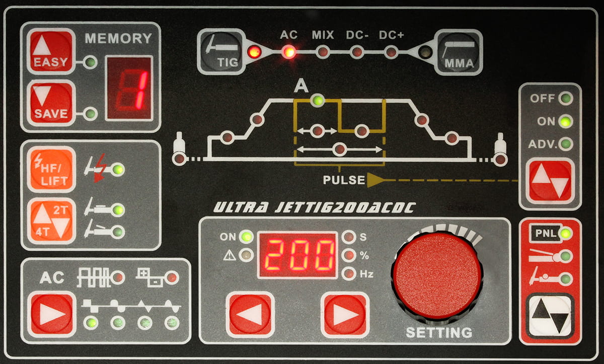 - TIG AC PULS HF - funkcja umożliwiająca spawanie wykonanych z aluminium elementów o małej grubości. Zajarzenie bezstykowe dzięki zastosowaniu jonizatora.