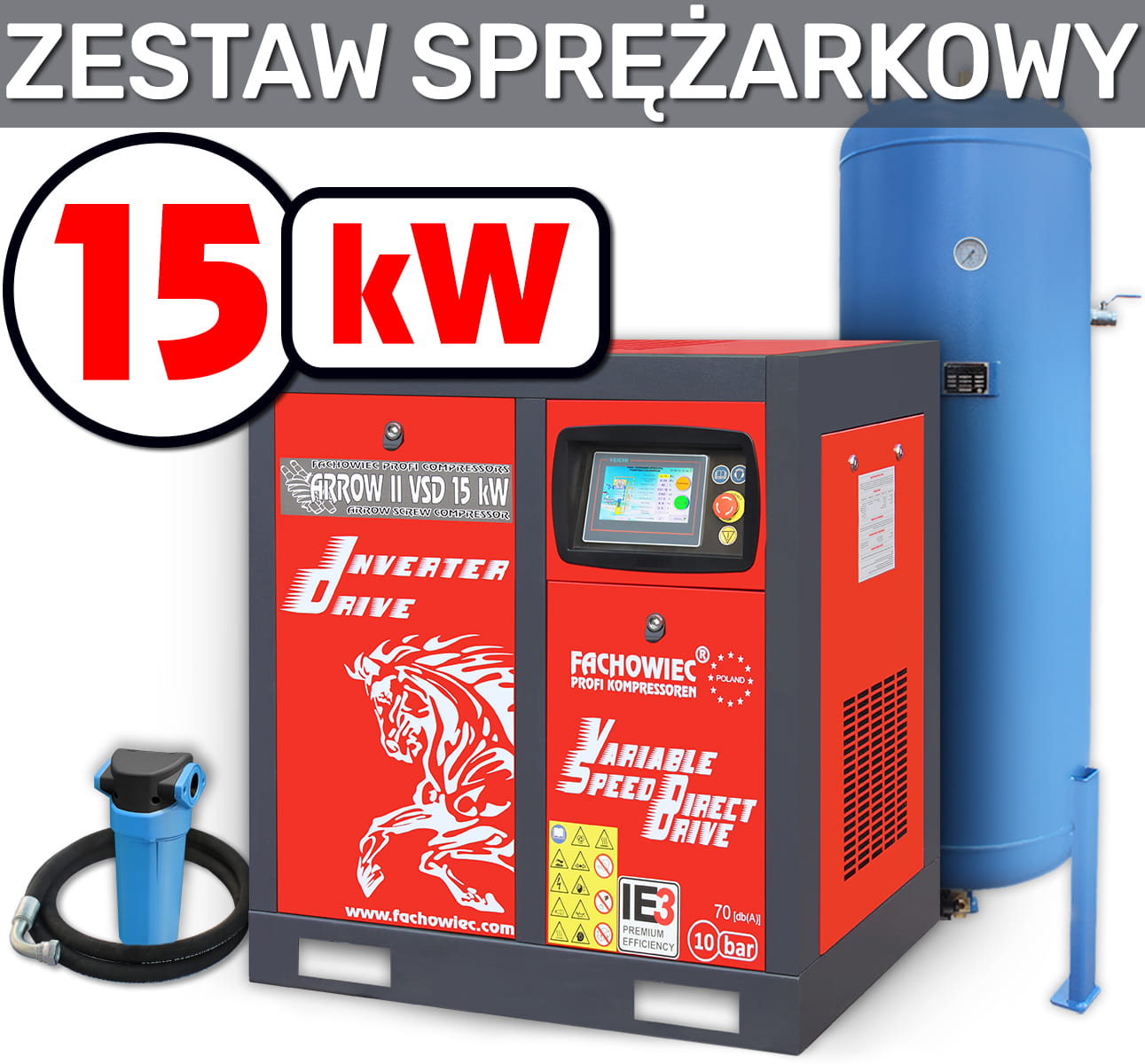 Sprężarka śrubowa ARROW II VSD 15 kW 720-1800 l/min. 10bar + zbiornik 500l + separator + osprzęt