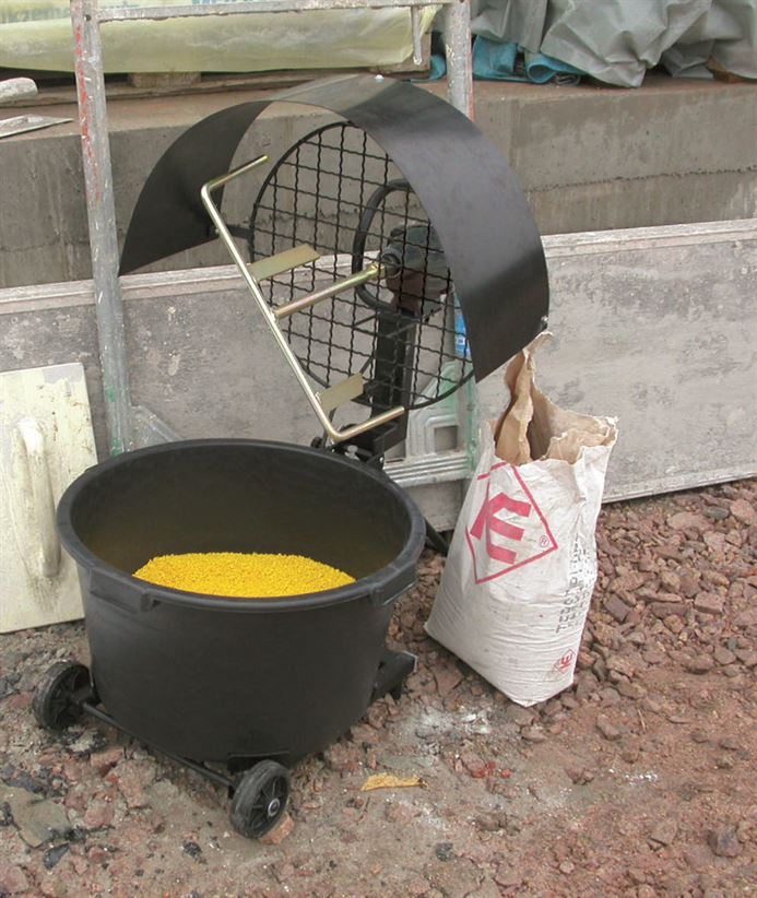 - Zewnętrzne mieszadło ze skrobakiem zapobiega przyklejaniu się materiału do dna wiadra, wewnętrzne mieszadło przyspiesza mieszanie materiału