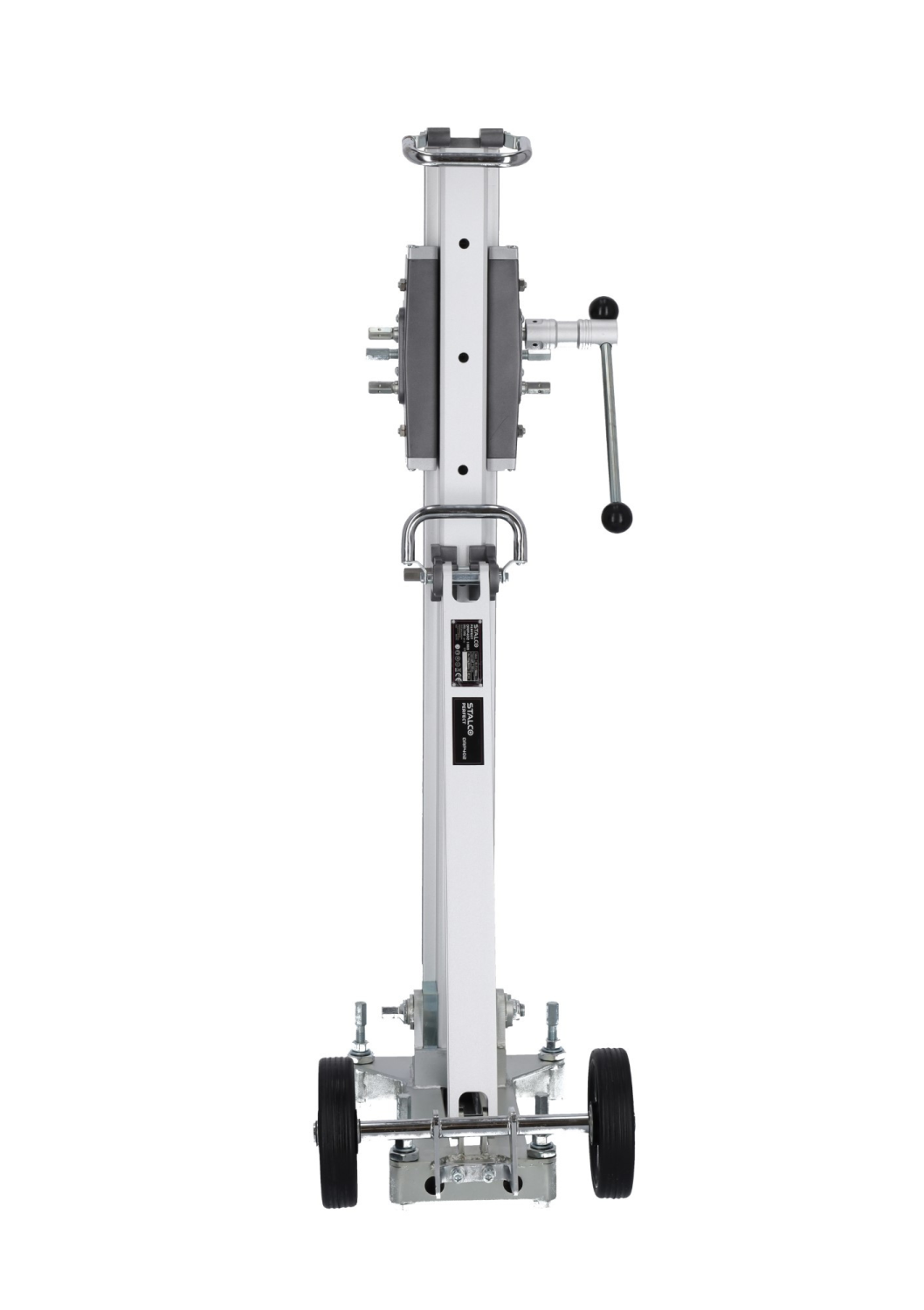 - łatwość transportu - statyw został wyposażony w uchwyt transportowy, a także w koła, które umożliwiają łatwe przenoszenie go na placu budowy, a także przewożenie pomiędzy stanowiskami