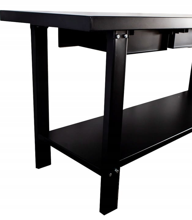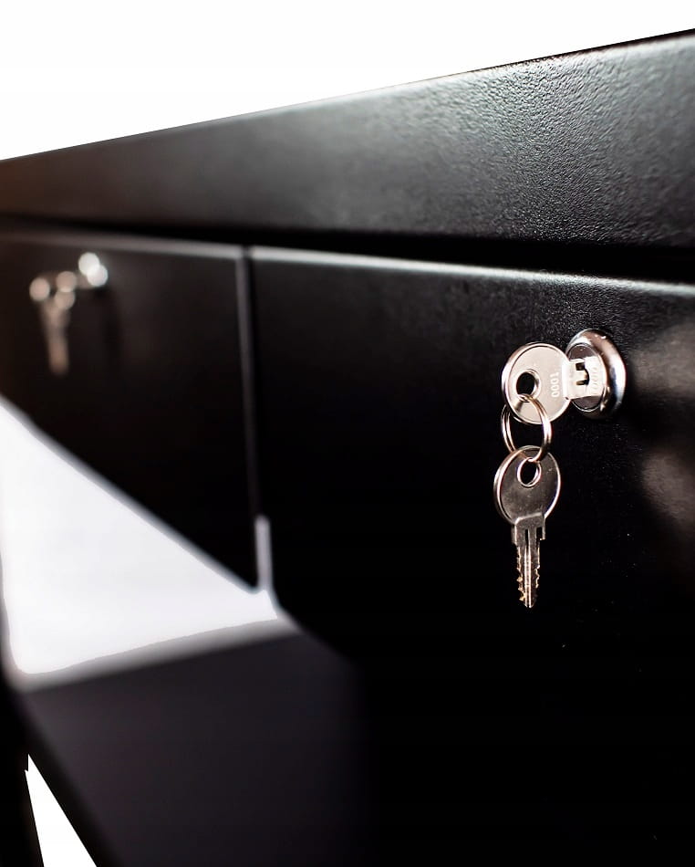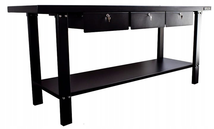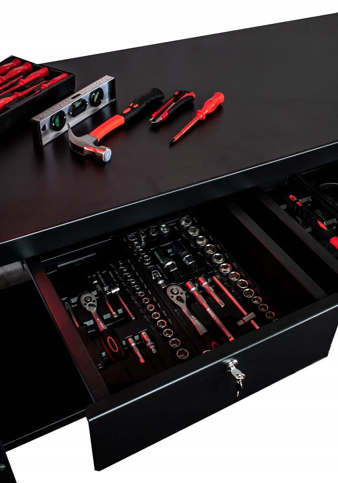 Stół wyposażony jest w trzy praktyczne szuflady, które pozwalają na bezpieczne przechowywanie narzędzi i akcesoriów. Szuflady zamykane są na kluczyk, co zwiększa bezpieczeństwo i chroni przed nieautoryzowanym dostępem. Metalowy blat jest nie tylko trwały, ale także łatwy do czyszczenia, co jest kluczowe w utrzymaniu porządku i higieny w warsztacie.