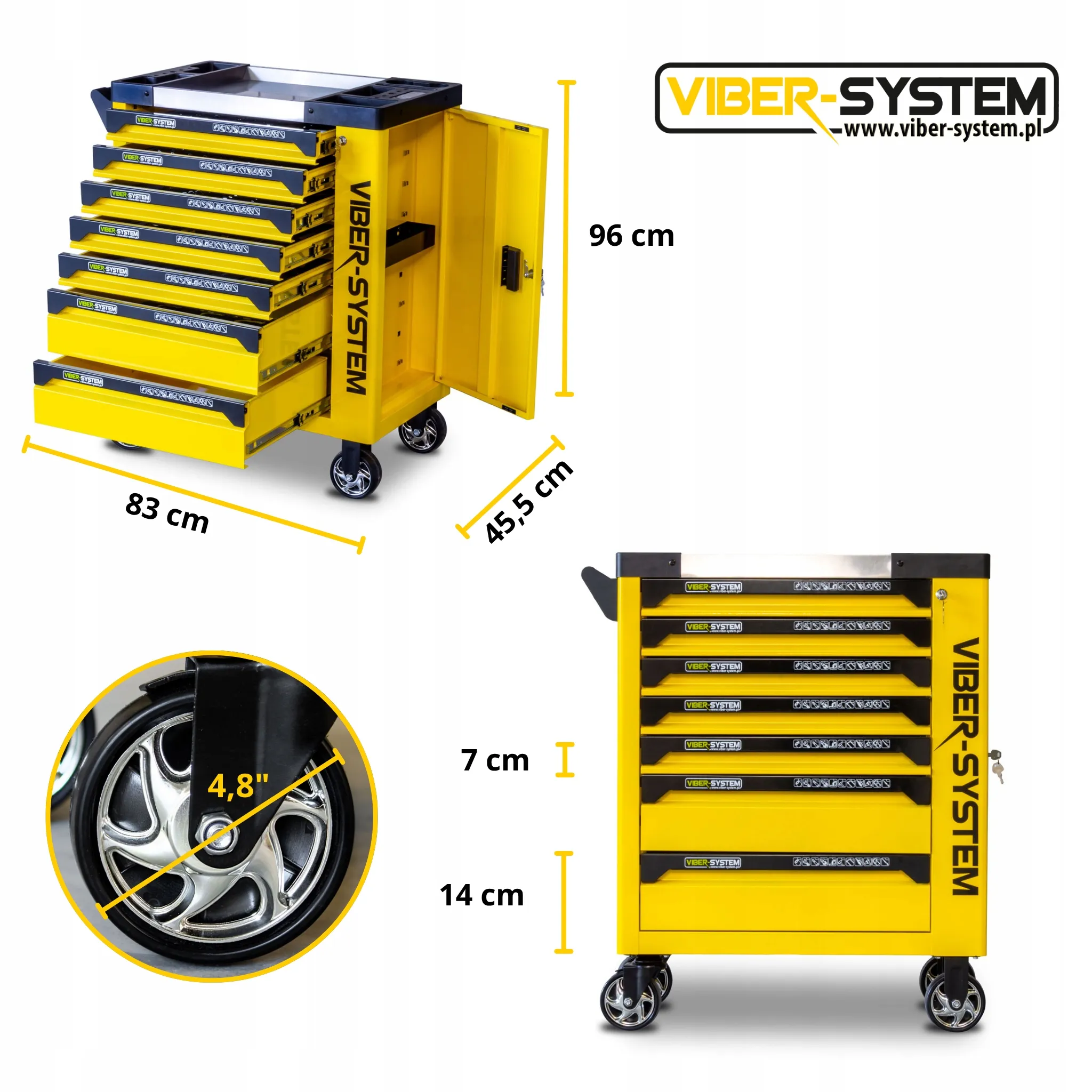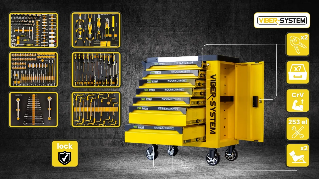 Viber-System SZN254 to wózek narzędziowy klasy premium, stworzony dla wymagających mechaników, serwisów technicznych oraz użytkowników ceniących porządek i efektywną pracę. Solidna konstrukcja ze stali SPCC, wykończona trwałą powłoką proszkową, zapewnia odporność na intensywną eksploatację, uderzenia i korozję – idealny wybór do profesjonalnych warsztatów i garaży.