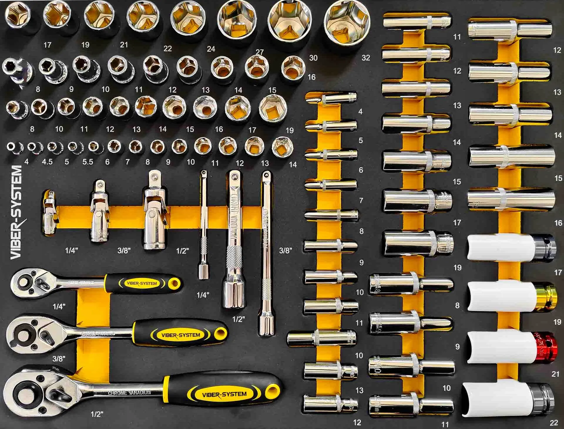- 8 szt. przedłużanych nasadek 3/8″ DR: 10–11–12–13–14–15–17–19 mm