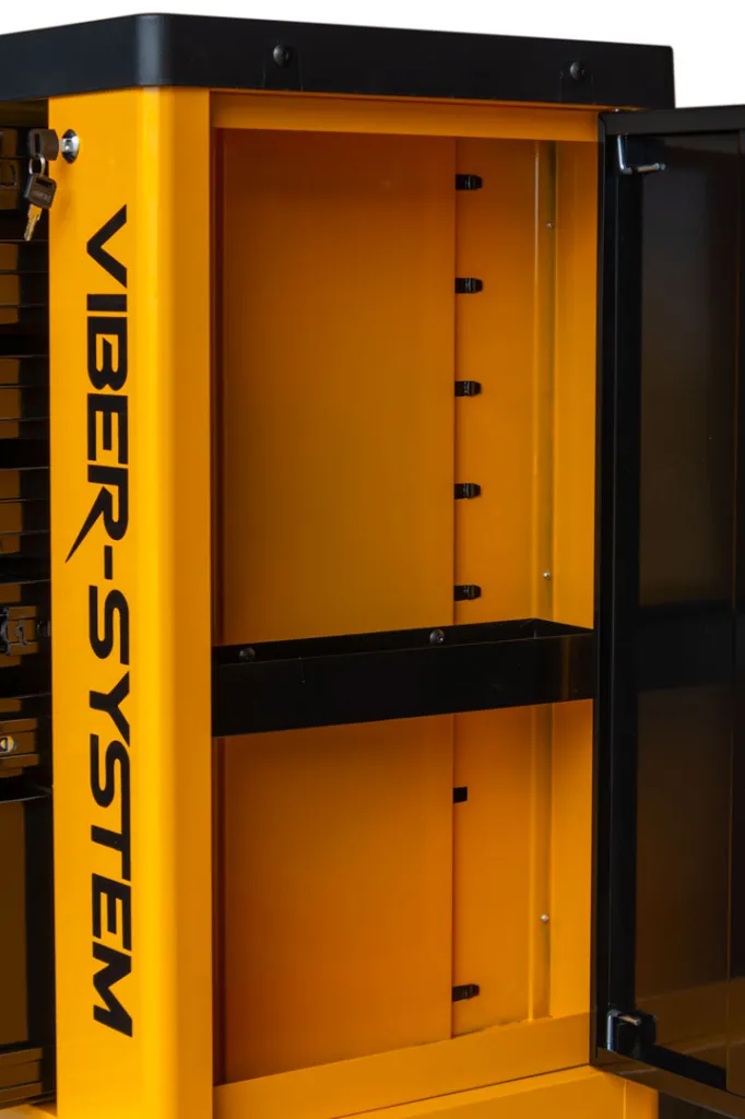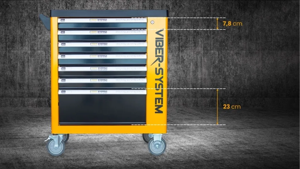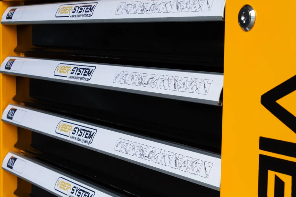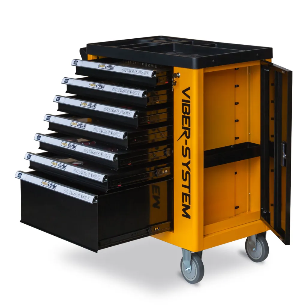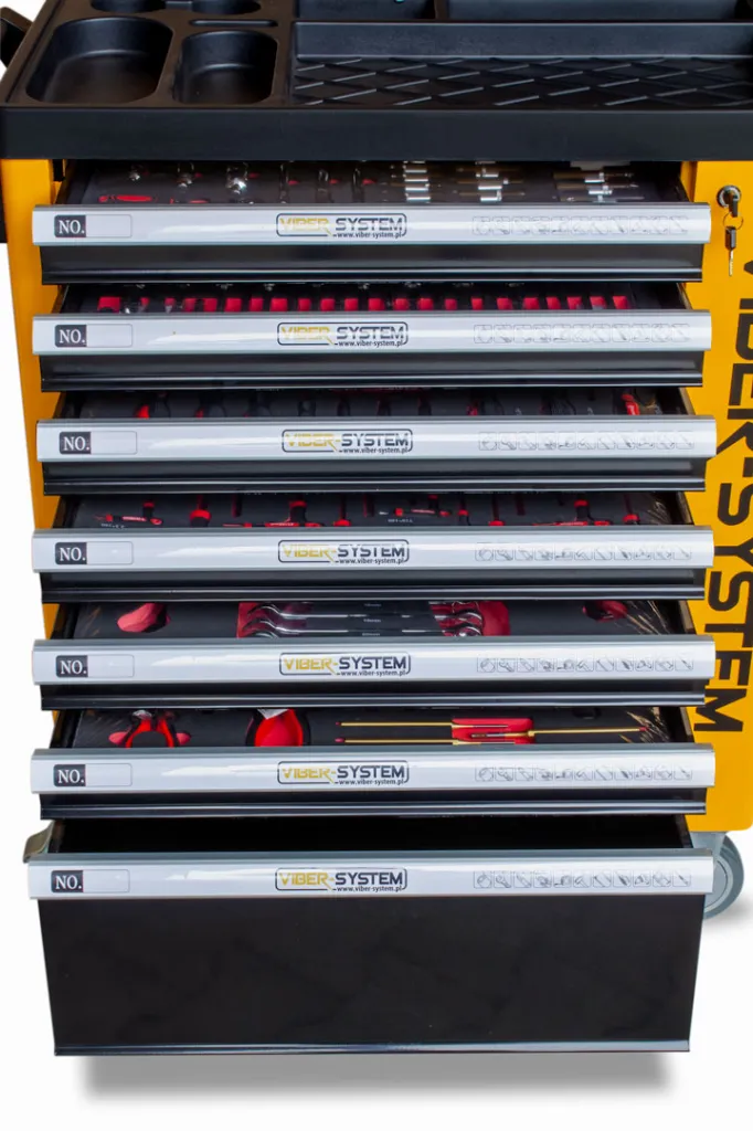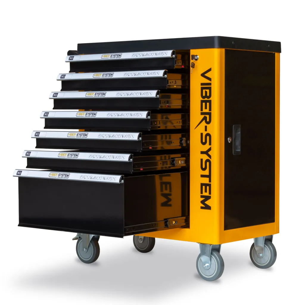 Szafka narzędziowa mobilna marki Viber-system to idealne rozwiązanie do zachowania ładu na stanowisku pracy aby mieć każde potrzebne narzędzie pod ręka. Wózek został wyposażony w ergonomiczne uchwyty wbudowane w blat oraz szuflady z pełnym wysuwem, które poruszają się na łożyskach kulkowych. Centralny zamek zamykający wszystkie szuflady, z podwójnymi ściankami oraz blokadą, zapewnia dodatkową ochronę. Cztery kółka umożliwiają łatwy transport. Blat z uniwersalną perforacją, wykonany z polipropylenu, jest odporny na oleje i smary. W zestawie znajduje się również pusta szuflada.