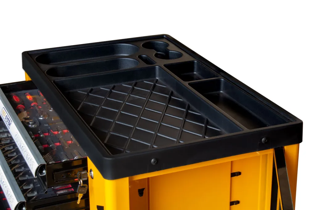 - Duża powierzchnia robocza - Blat wózka zapewnia przestrzeń do pracy, umożliwiając wygodne manipulowanie narzędziami.