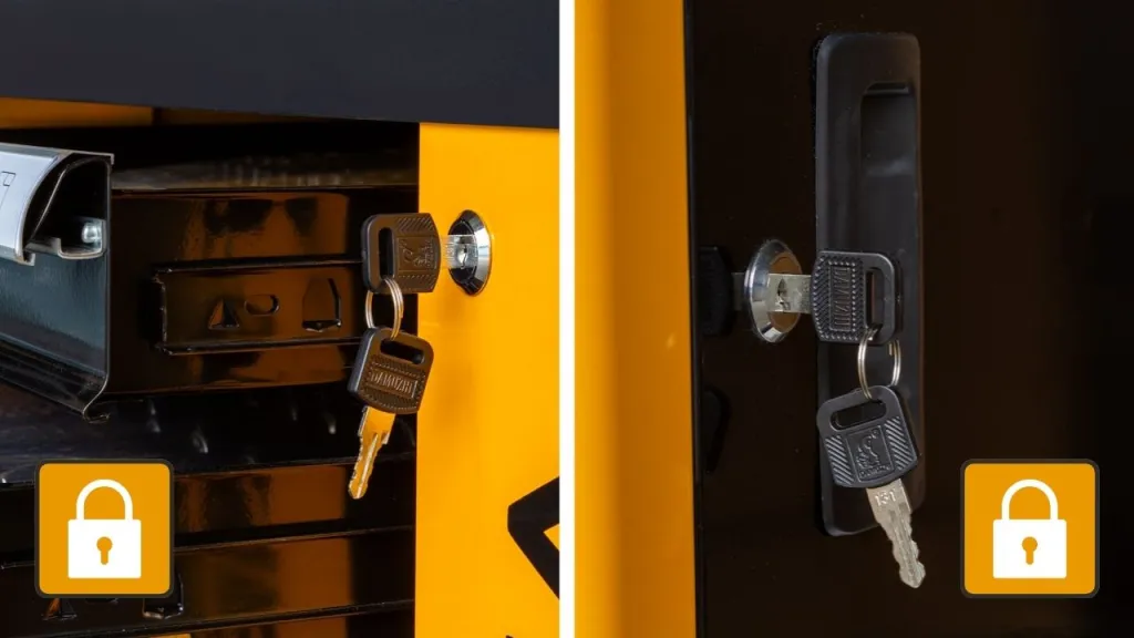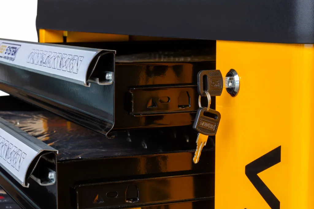 - Centralny zamek - Wyposażony w dwa klucze, zamyka wszystkie szuflady, zapewniając bezpieczeństwo przechowywanych narzędzi.