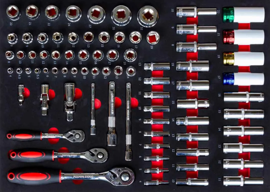 - 17 szt. nasadek 1/2"DR (stal chromowo-wanadowa): 8, 9, 10, 11, 12, 13, 15, 16, 17, 19, 20, 21, 22, 24, 27, 30, 32 mm