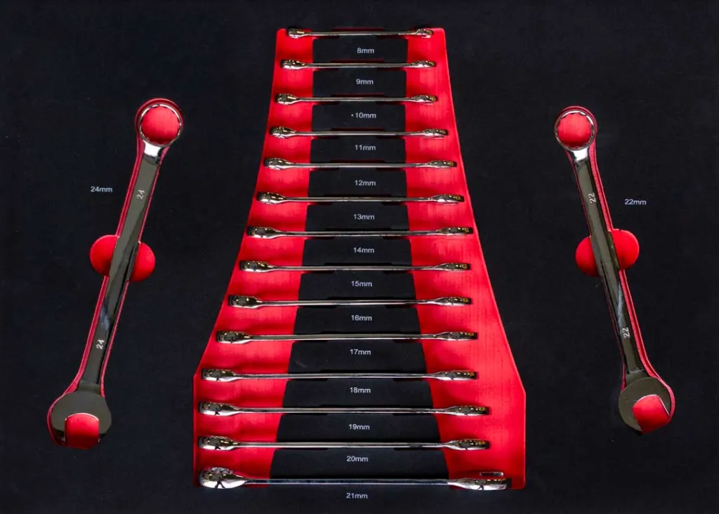 16 szt. kluczy płasko-oczkowych: 8, 9, 10, 11, 12, 13, 14, 15, 16, 18, 19, 20, 21, 22, 24 mm