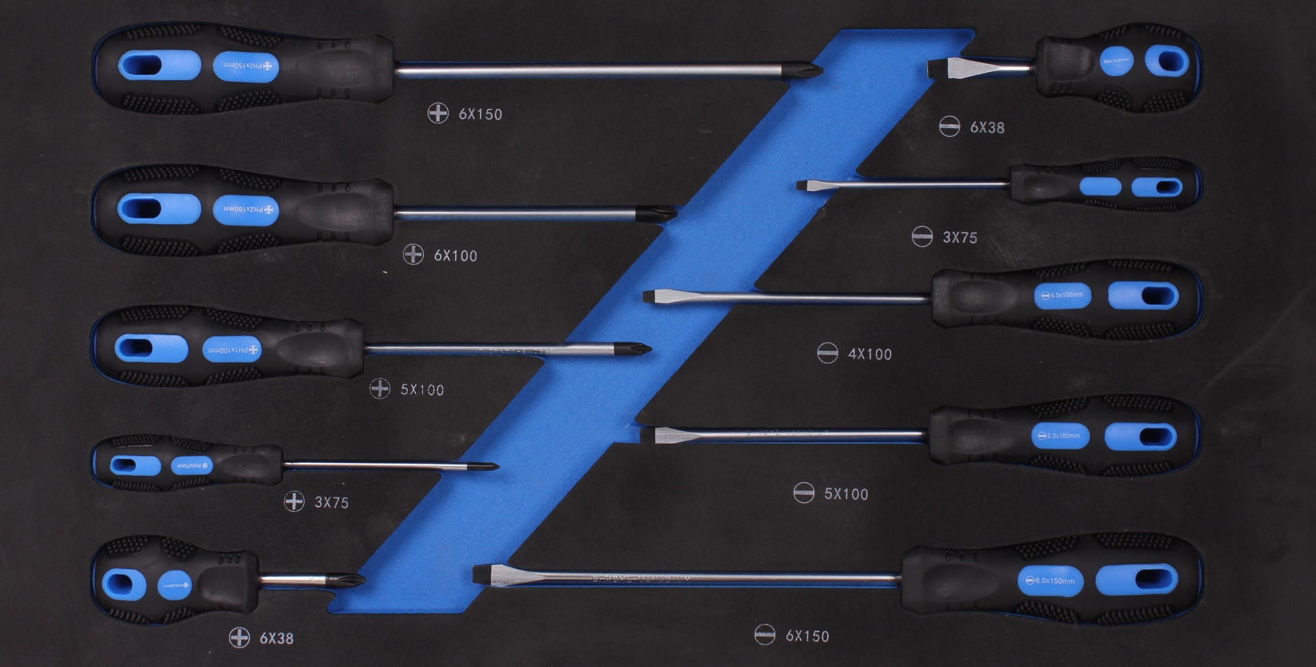 Profesjonalny zestaw ze stali chromowo-wanadowej w skrzyni metalowej z trzema szufladami na klucz.