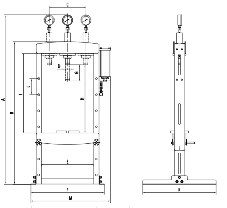 Dla wygody i bezpieczeństwa użytkowania wszystkie prasy wyposażono w manometr glicerynowy, który precyzyjnie wskazuje ciśnienie robocze oraz dwie pryzmy V z blokadą przesuwu, umożliwiające stabilne podparcie detali. W modelach o większej sile nacisku (50, 75 i 100 ton) dodatkowo zastosowano mechanizm korbowy podnoszenia stołu, ułatwiający jego regulację.