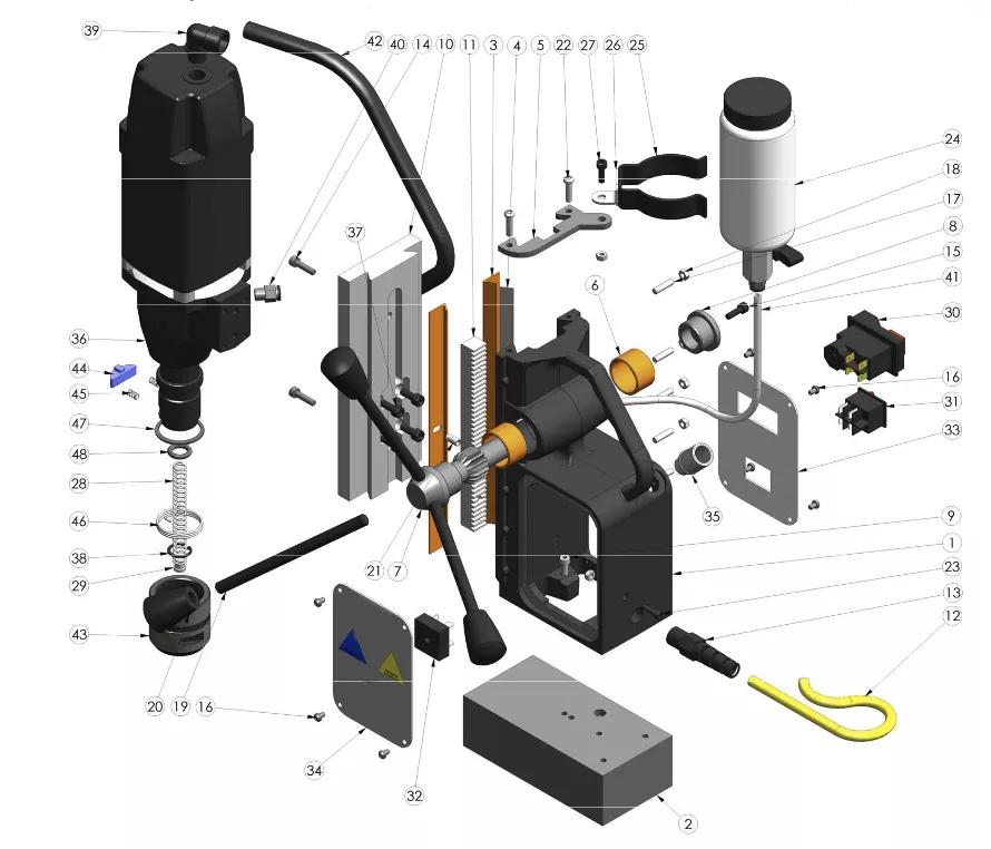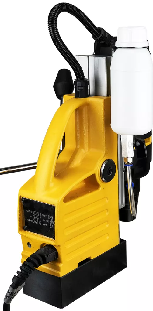 Wiertarka Magnetyczna MB 35 ze stopą magnetyczną posiada silnik o dużej mocy – 1050 W – dzięki czemu praca jest efektywna oraz stabilna. Dbałość o szczegóły, jakość wykończenia, jak i ergonomiczna budowa przy stosunkowo małej wadze – 11,6 kg – pozwalają na precyzyjną pracę. W przypadku wierteł trepanacyjnych możliwe jest wiercenie otworów o średnicy nawet do 35 mm. Dodatkowo dzięki zintegrowanemu systemowi chłodzenia chłodziwo wprowadzane jest bezpośrednio ze zbiornika do wrzeciona wiertarki.