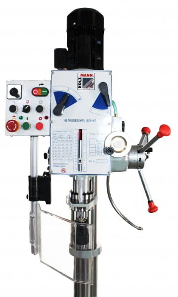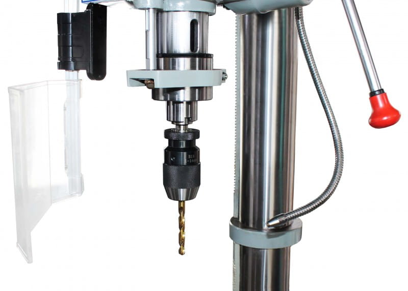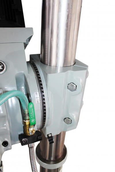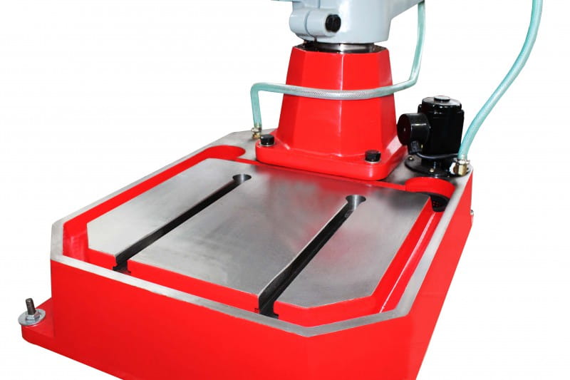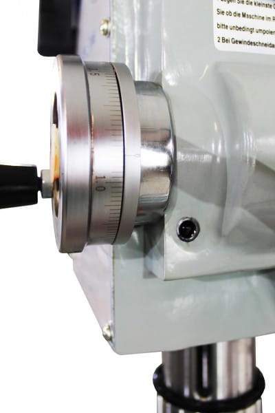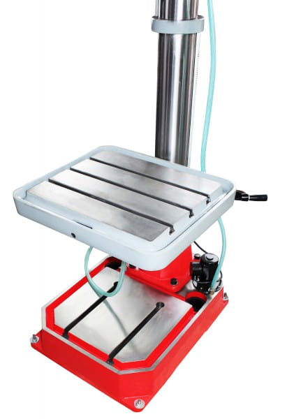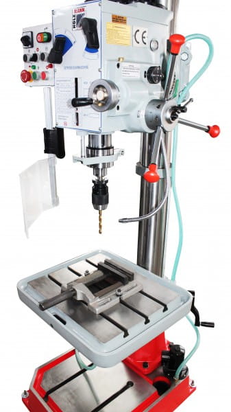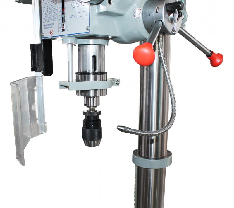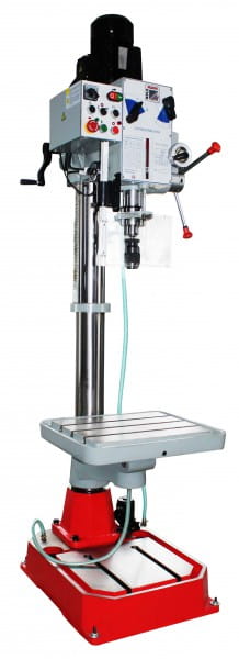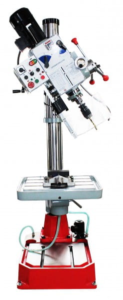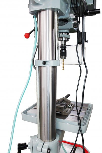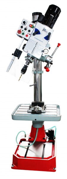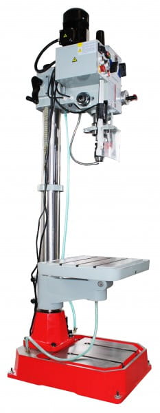 Bardzo duża elastyczność pracy dzięki obrotowej głowicy z regulacją wysokości, istnieje możliwość gwintowania oraz obroty w lewą stronę i w prawą stronę, dosuw tulei wrzecionowej poprzez trójramienną dźwignię i precyzyjne koło ręczne z podziałką głębokości, przekładnia olejowa ze szlifowanymi i hartowanymi kołami przekładni, solidna podstawa gwarantująca dużą stabilność, mocny silnik gwarantujący dobrą wydajność wiercenia, sztywna kolumna ze szlifowaną powierzchnią, odchylana osłona uchwytu zaciskowego z pleksiglas, 2-stopniowy silnik umożliwiający zwiększenie prędkości obrotowej, odłączany automatyczny posuw pionowy z trzema różnymi prędkościami 0-0,12-0,18-0,24mm/obr., duży i obrotowy stół z odlewu z regulacją wysokości do obróbki ciężkich przedmiotów, stół z rowkami teowymi 14 mm umożliwiającymi ustawienie imadła itp., system chłodzenia w wyposażeniu standardowym, bardzo szerokie koła zębate przekładni.