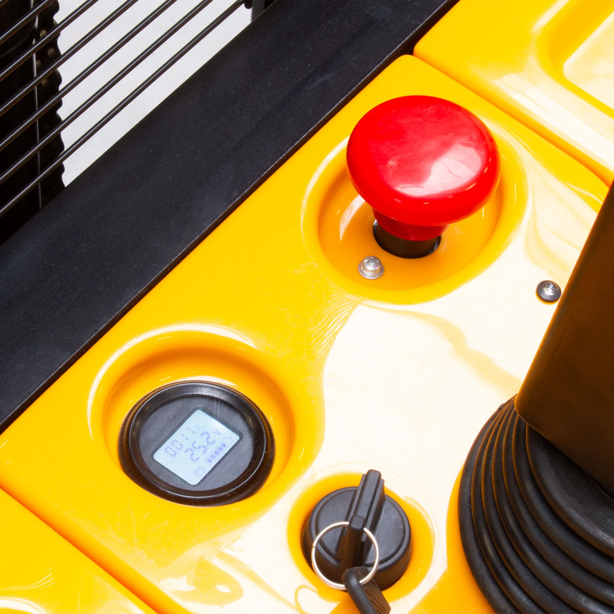 - Bezpieczna eksploatacja – przycisk awaryjny STOP, hamulec elektromagnetyczny, ogranicznik prędkości i dźwięk cofania.