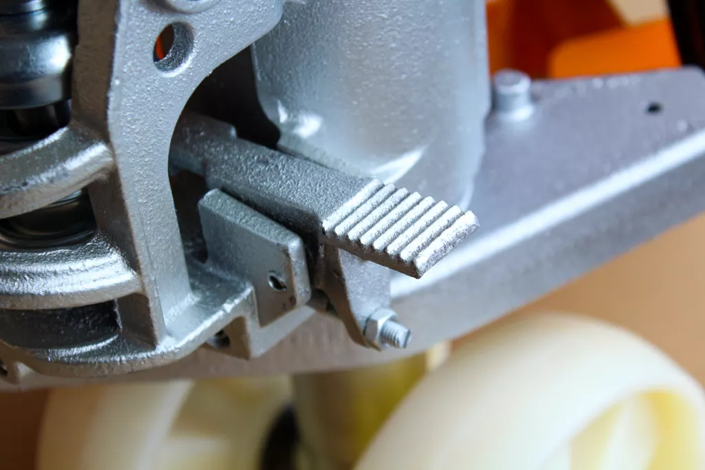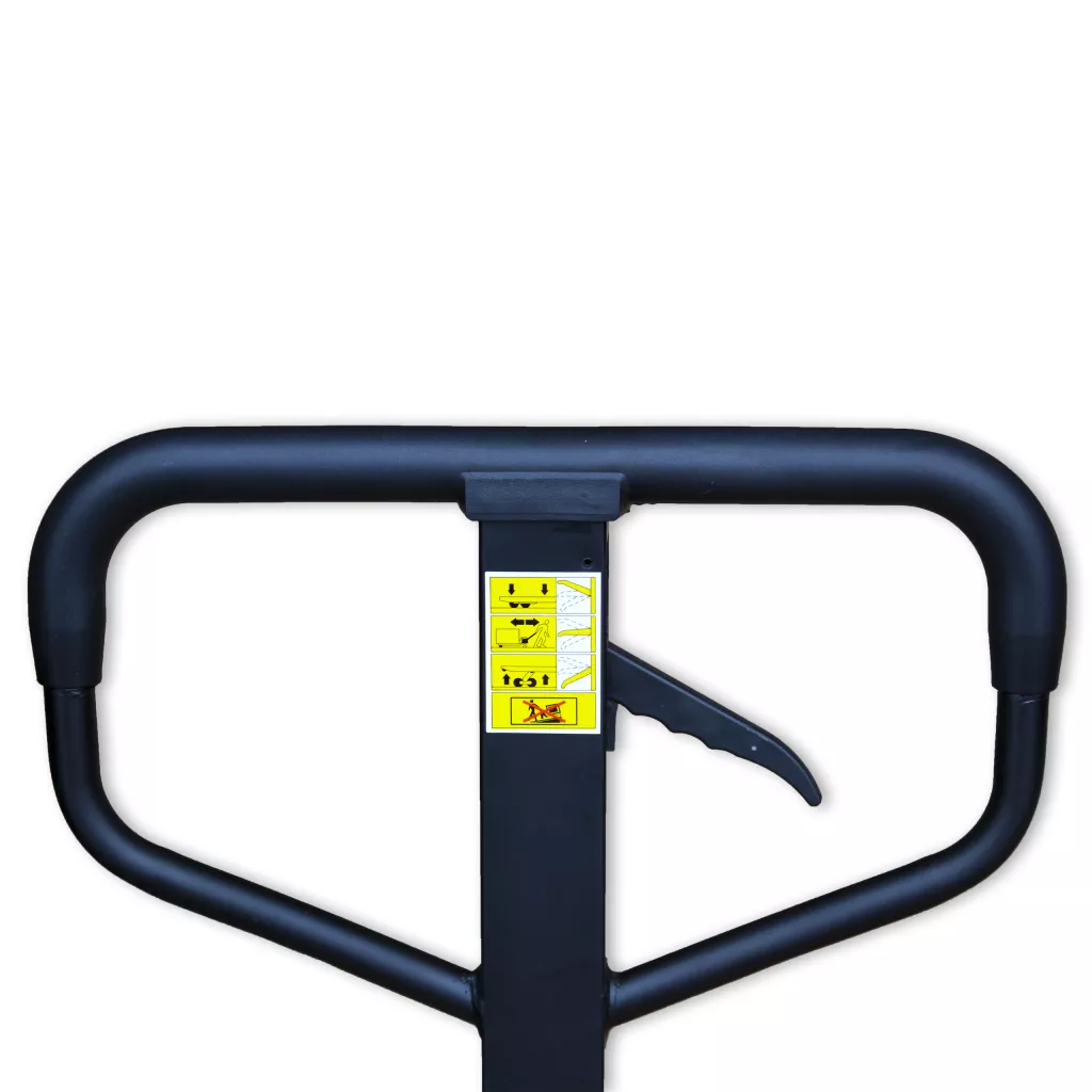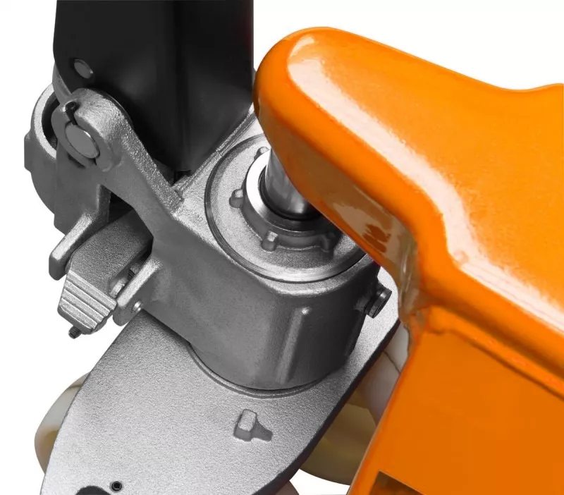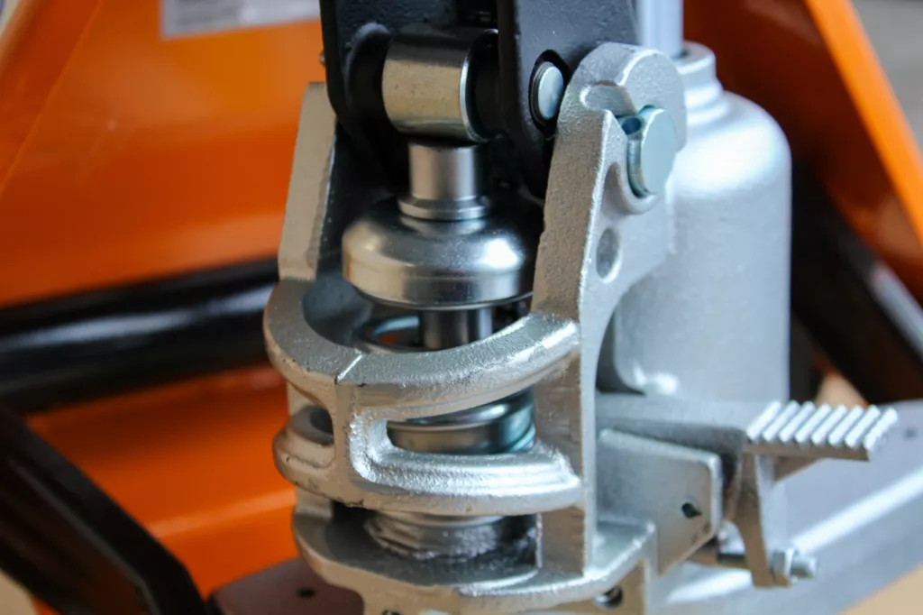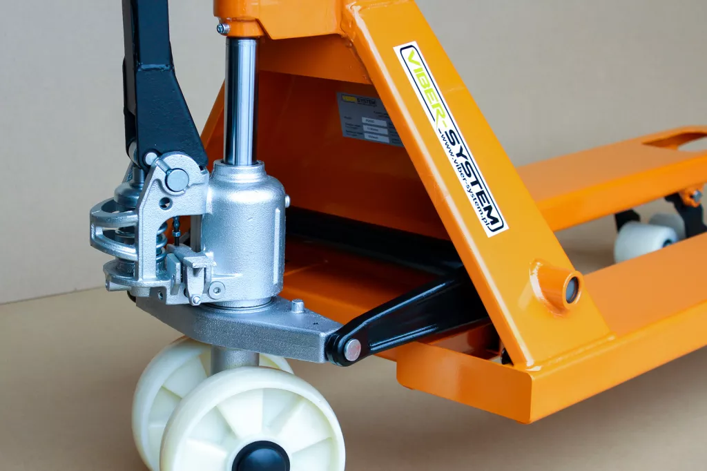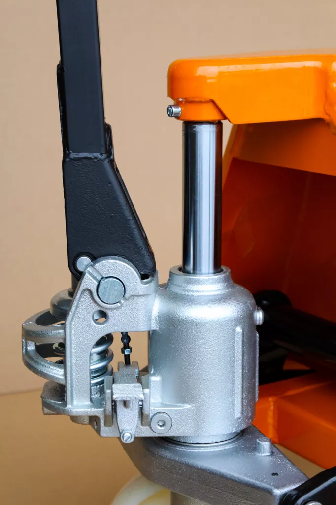 Wózek paletowy wyposażony w pompę hydrauliczną z chromowanym tłokiem i zaworem bezpieczeństwa zapobiegającym przeciążeniu urządzenia.