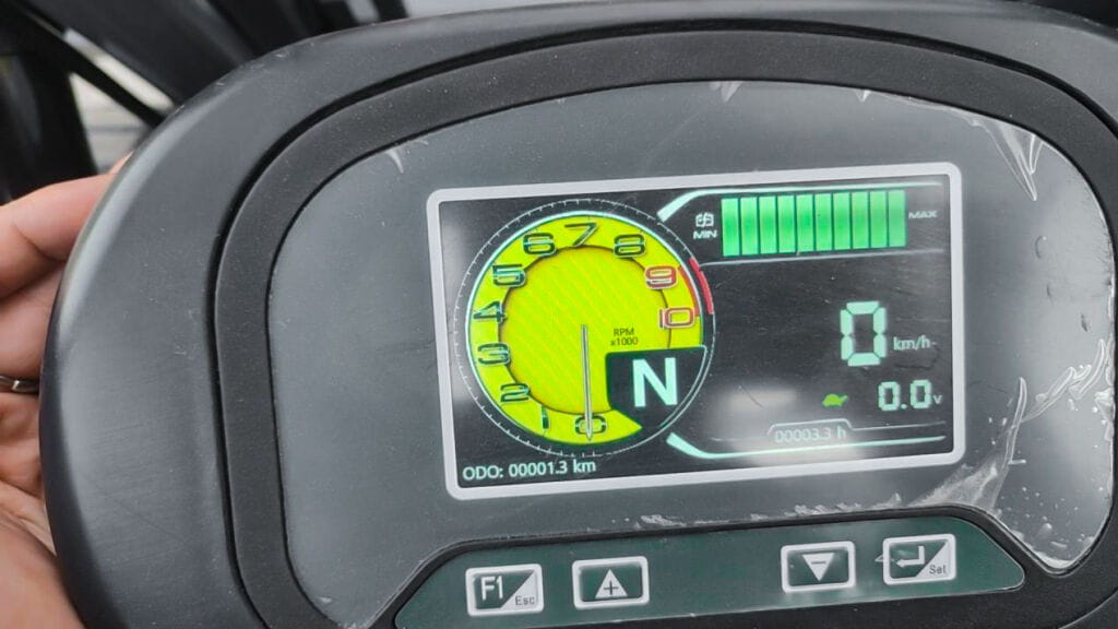 Wyświetlacz jest nowoczesnym, kolorowym panelem z czytelnym podziałem na kilka sekcji informacyjnych. Po lewej stronie znajduje się duży obrotomierz (RPM) z zaznaczonymi wartościami od 0 do 10 tysięcy obrotów, a w środku widoczny jest wskaźnik trybu jazdy (np. „N” oznaczające neutral). Po prawej stronie umieszczony jest wskaźnik poziomu naładowania akumulatora (od „MIN” do „MAX”), cyfrowy prędkościomierz (km/h) oraz aktualne napięcie lub inne parametry pojazdu. W dolnej części ekranu znajdują się odczyty licznika przebiegu (ODO), czasu pracy (h) oraz przyciski funkcyjne (F1/Esc, +/- i Set), umożliwiające zmianę ustawień lub wyświetlanych informacji. Całość jest przejrzysta i intuicyjna, co ułatwia obsługę maszyny.