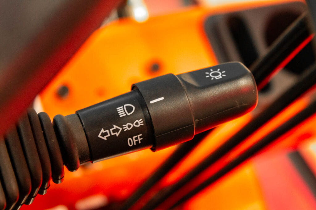 Z przodu zastosowano białe reflektory LED zamocowane w metalowej obudowie, które skutecznie doświetlają przestrzeń roboczą. Obok nich znajdują się pomarańczowe kierunkowskazy, które dodatkowo sygnalizują manewry operatora.