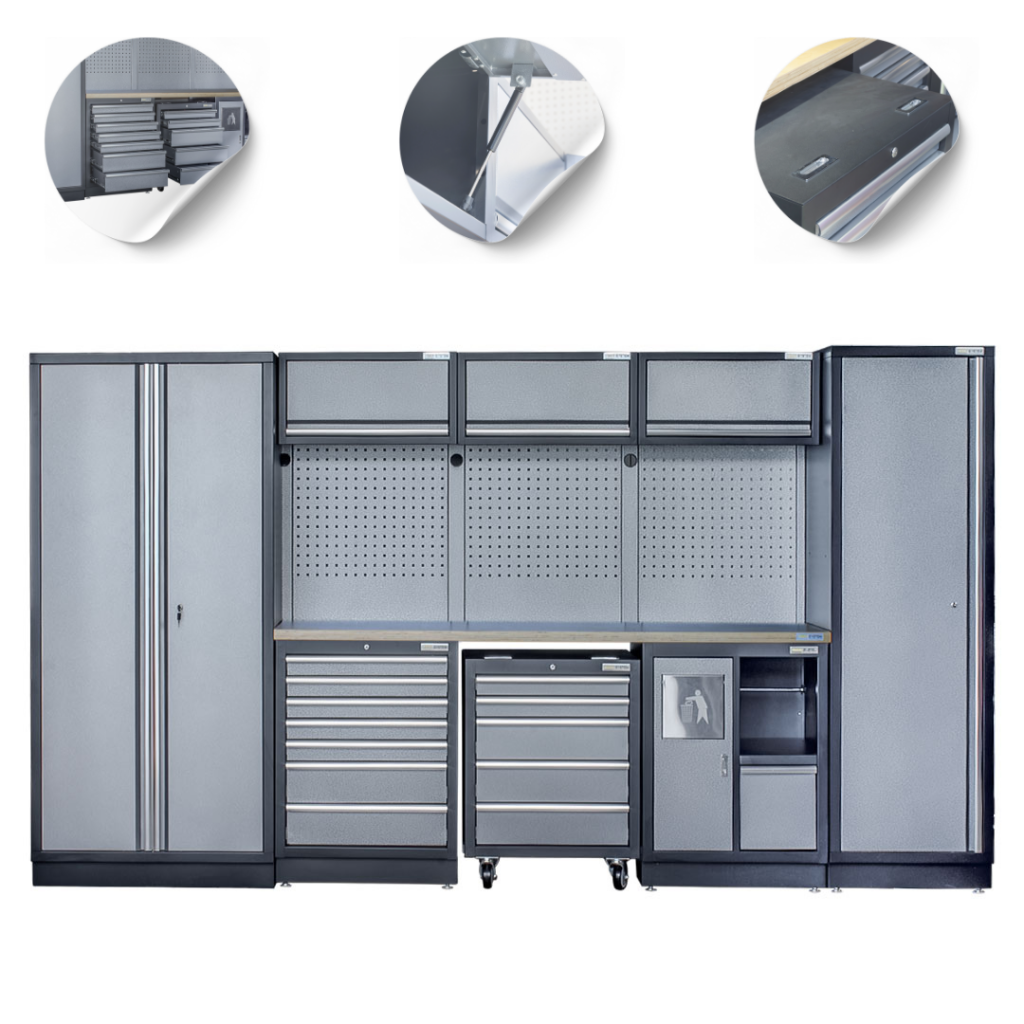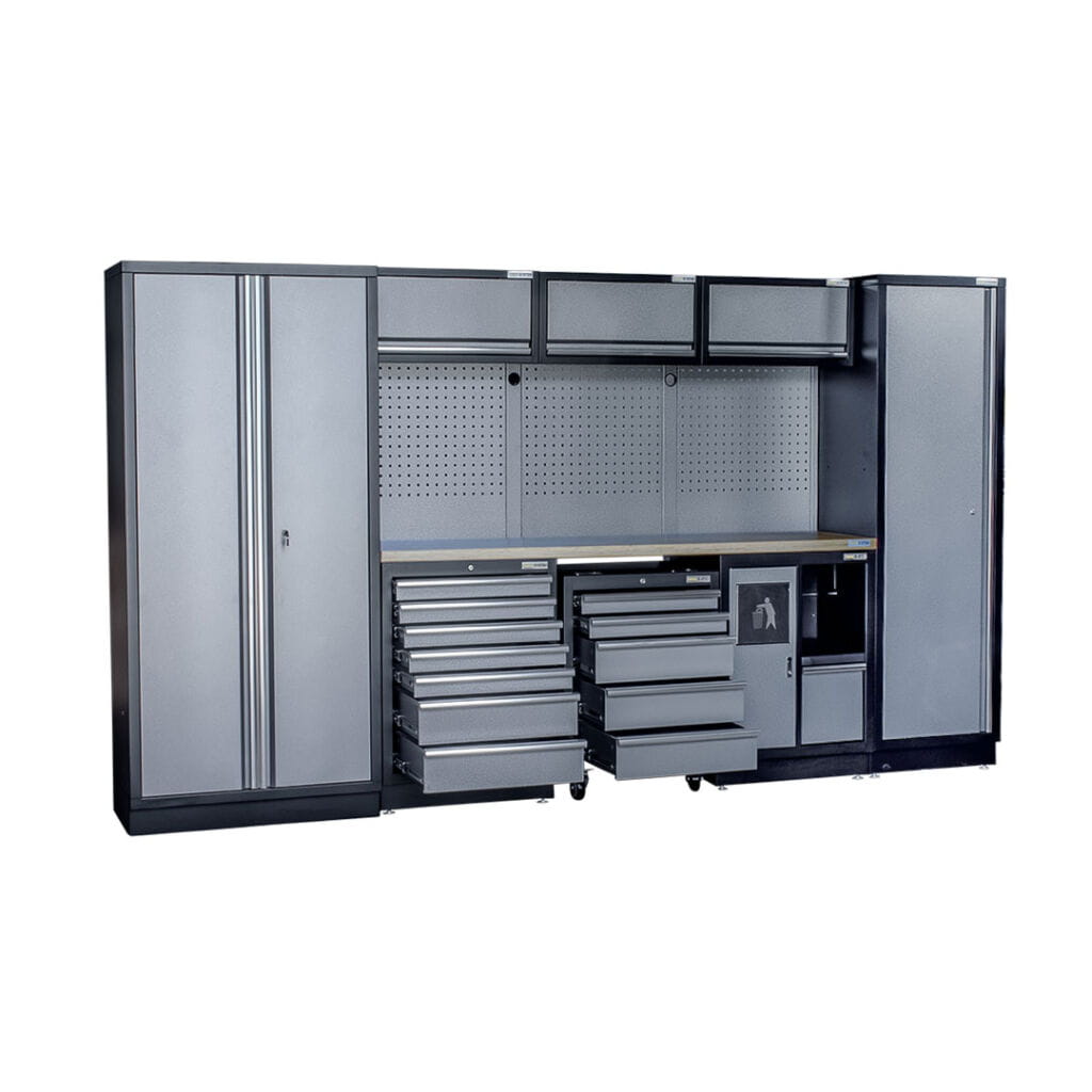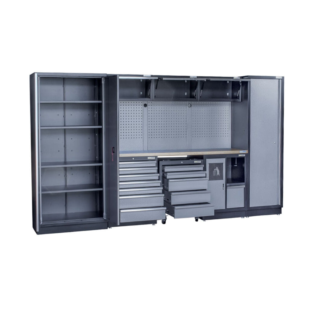 - Duża Pojemność: Przestronne szafki i półki w naszym zestawie pozwalają na wygodne przechowywanie wszelkiego rodzaju narzędzi i sprzętów warsztatowych, co ułatwia utrzymanie porządku i organizacji w miejscu pracy.