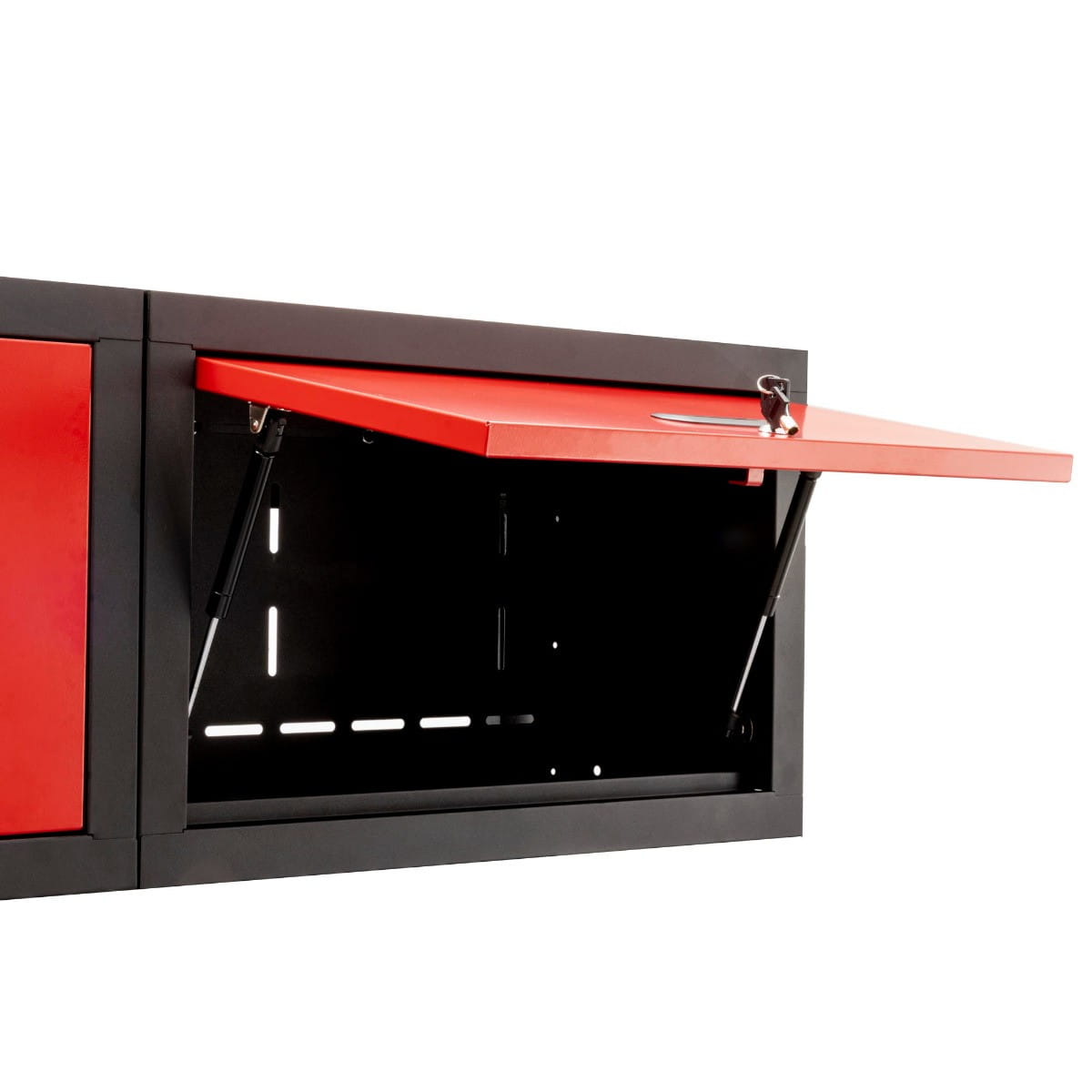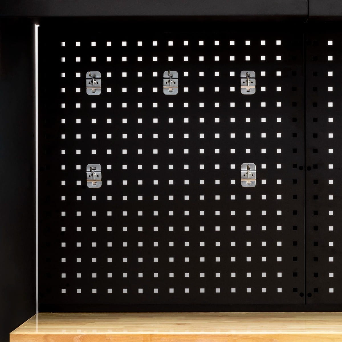 Tylna ściana składa się z dwóch płyt ściennych. Na płytach można zawiesić 10 haczyków dołączonych do zestawu, które doskonale sprawdzą się do zawieszania narzędzi pneumatycznych i kluczy. Wygodne rozwiązanie, gdy chcesz mieć wszystko pod ręką. W zestawie dołączone są dwie płyty.