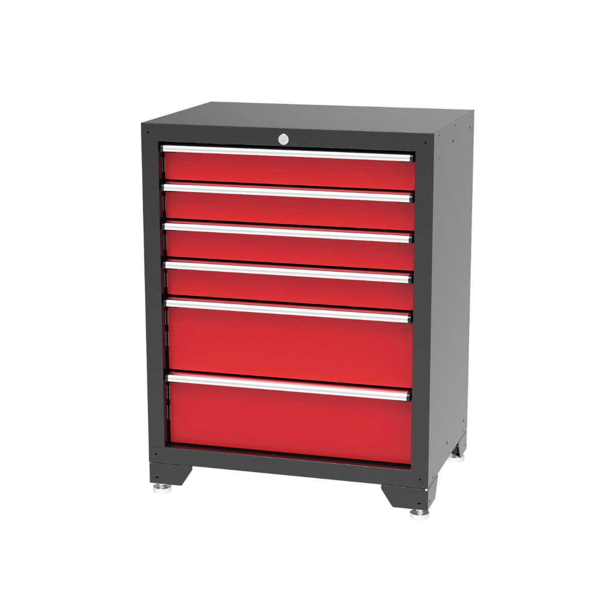 Szafka dolna posiada 6 szuflad. Całkowita obudowa ma wymiary 65 x 43 x 80 cm. 4 szuflady są mniejsze i mają wymiary 54 x 38 x 8 cm. Dwie duże szuflady mają wymiary 54 x 38 x 16,5 cm. Szuflady są centralnie zamykane, dzięki czemu można bezpiecznie przechowywać w nich narzędzia.